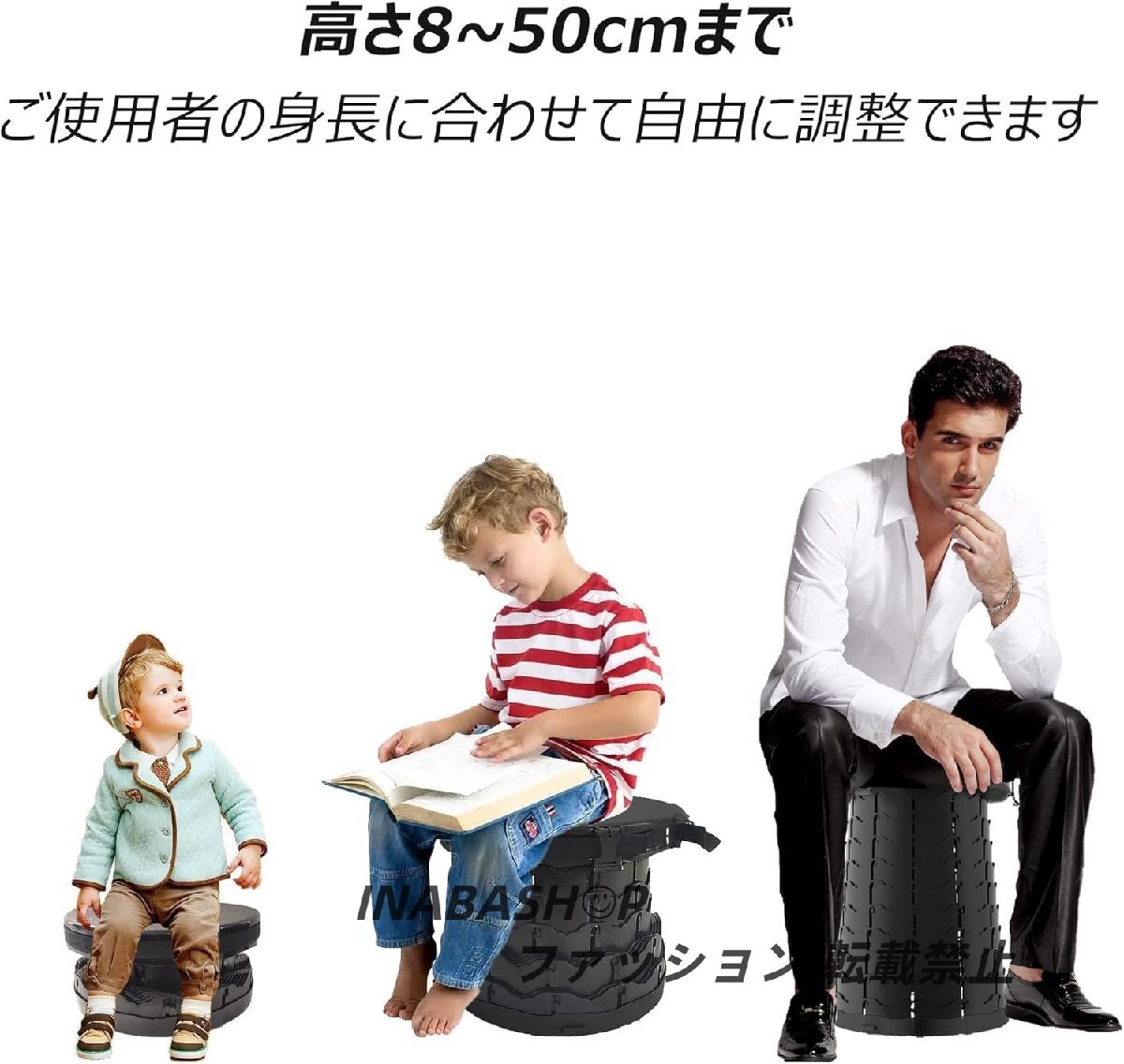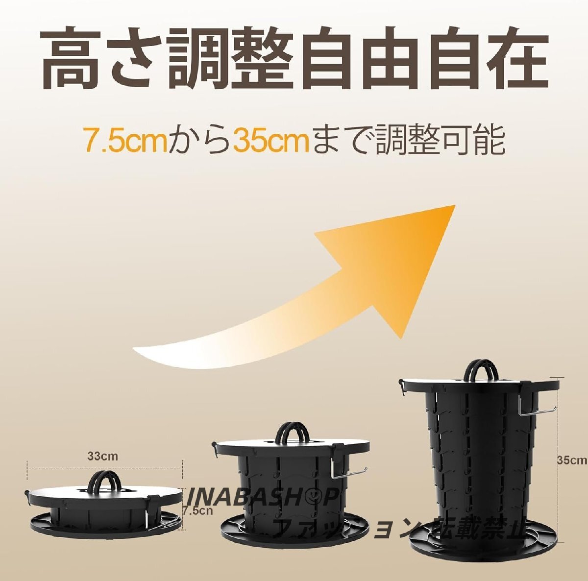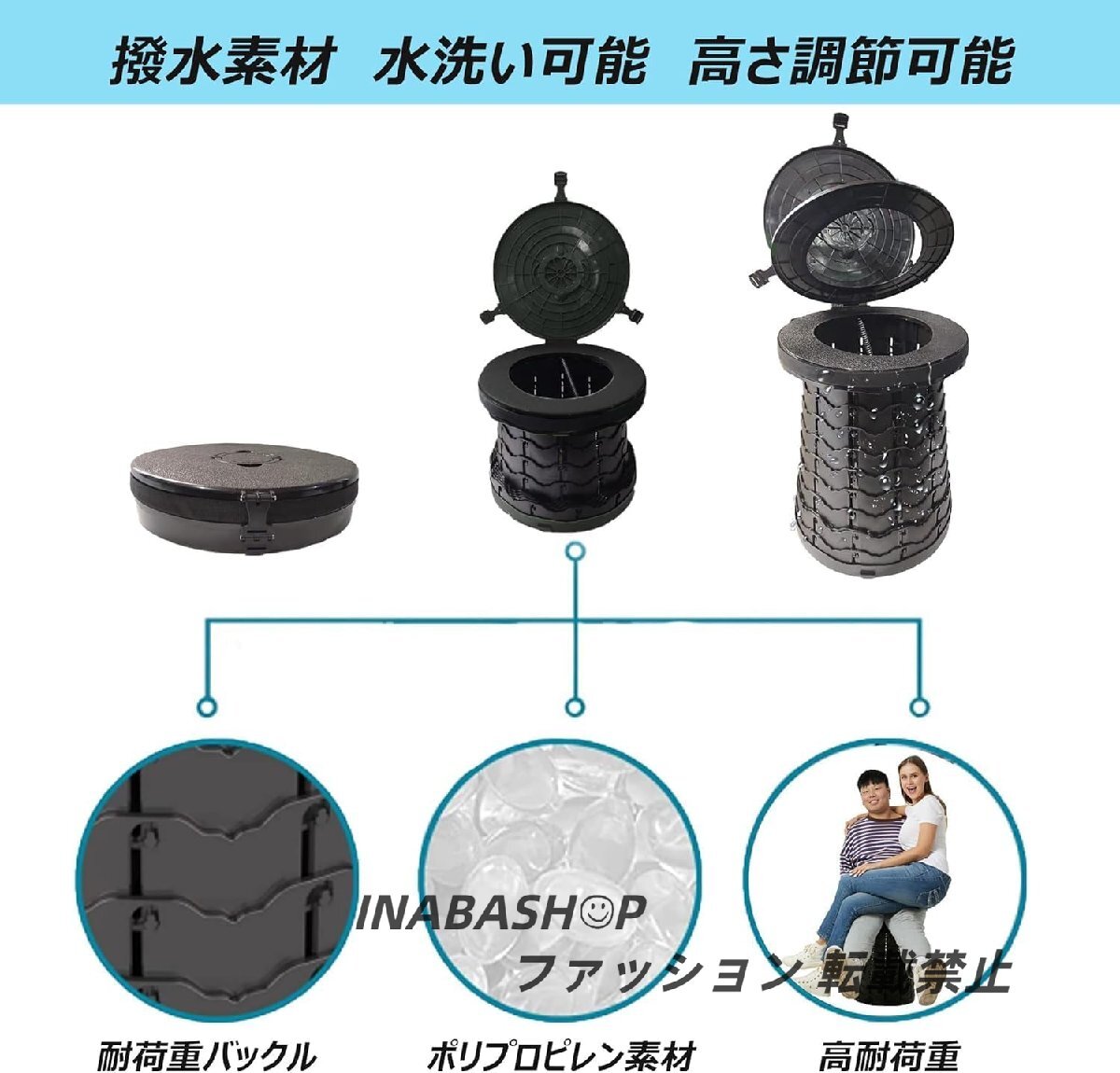 【軽量&400kgの耐荷重】高品質なポリプロピレン材質を採用し、ほかのABS製携帯トイレと違って400kgの耐荷重を実現でき、頑丈で高い耐久性がある簡易トイレです。さらにウロコ構造で10段階(8~50cm)の高さ調整と固定が可能、抜群な安定性があります。