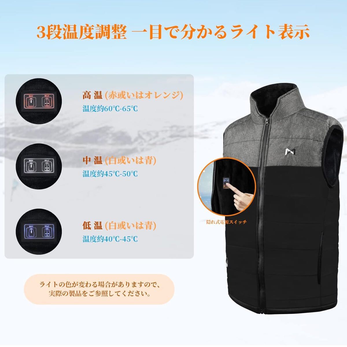 【6つのヒーターと3段の温度調節】:暖かい秘密は、左右腹部部分、首部、背中中央部分に電気ヒーターを設け、温かみを保つことです。非常に細かく柔らかく特殊な発熱繊維を使用しており、動作性に影響を及ぼすことなく、快適な着心地を実現しています。暖かく、軽く、動きやすい3拍子のベスト。また、温度範囲は、40°Cから6°Cまでの温度範囲で3段調節可能。温度調節は3段(強赤)、中(白)、弱(青)に分けられます。色によって異なる温度段階も一目で分かり、ボタンを押すと簡単に温度調節ができます。