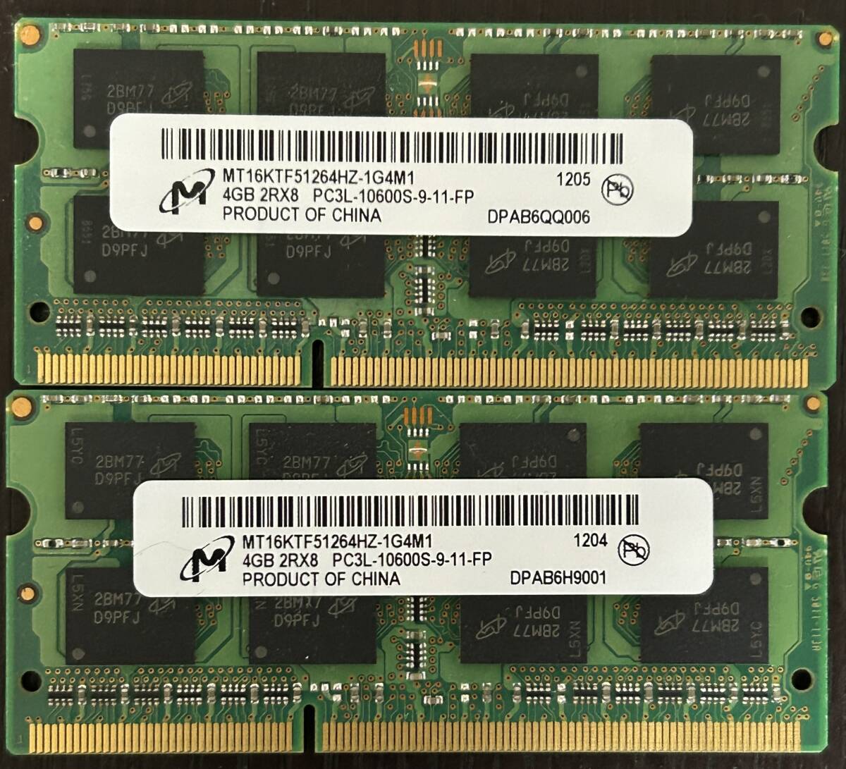 即決 動作確認済み Micron マイクロン SO-DIMM 204pin DDR3L PC3L-10600S 4GB×2枚1.35V低電圧対応 1.5V対応 ノートパソコン用 813