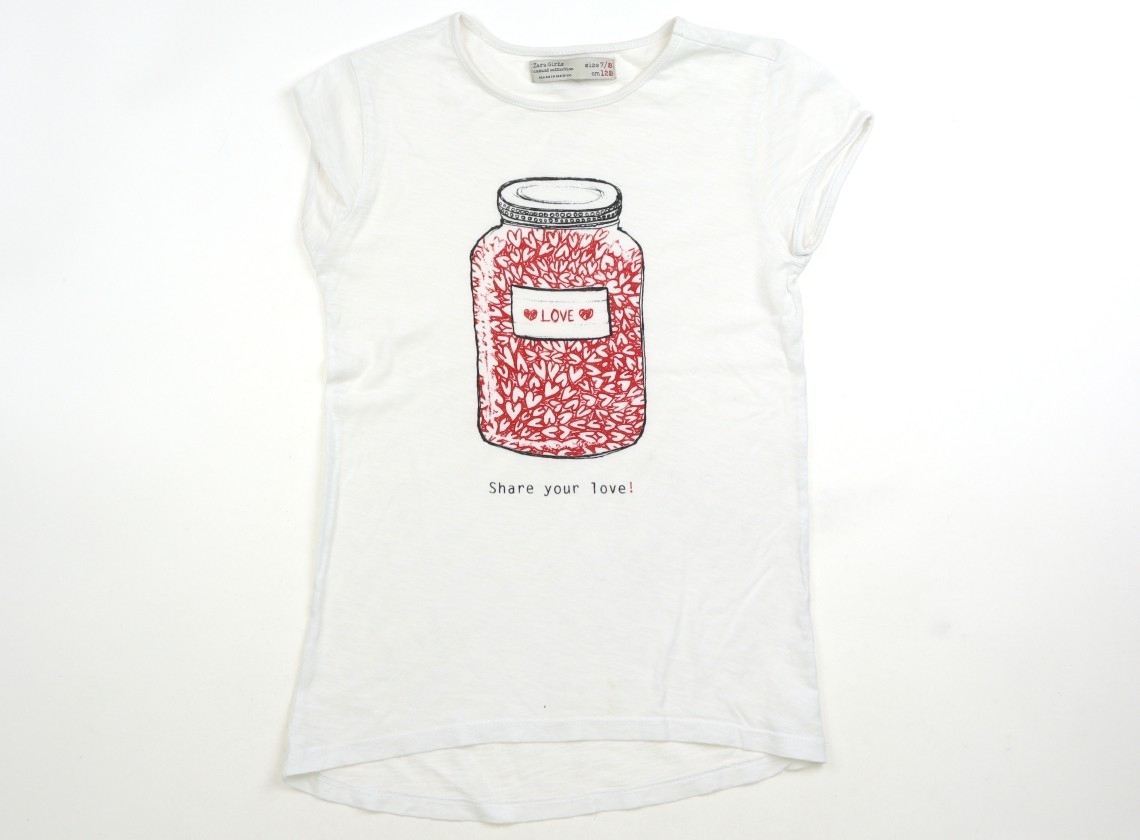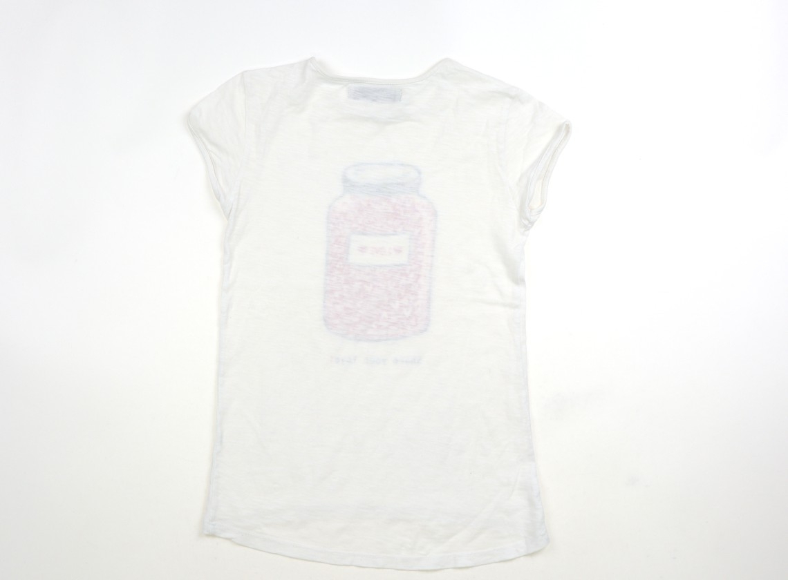 実際のサイズ表記は128cmです。素材タグが切られています。前身頃裾に黄色いシミが複数ありますが、まだお使い頂けそうです。