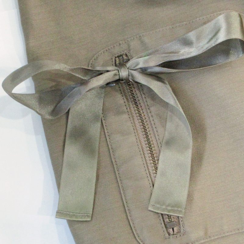 【状態】袖や縫い目部分に素材特有の擦れ、若干の色落ちがあります。 ※リボン部分はもともとの付属品かどうかは不明です。また、リボン自体に金具の色移りがあるためおまけ程度にお考えください。