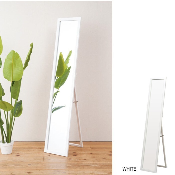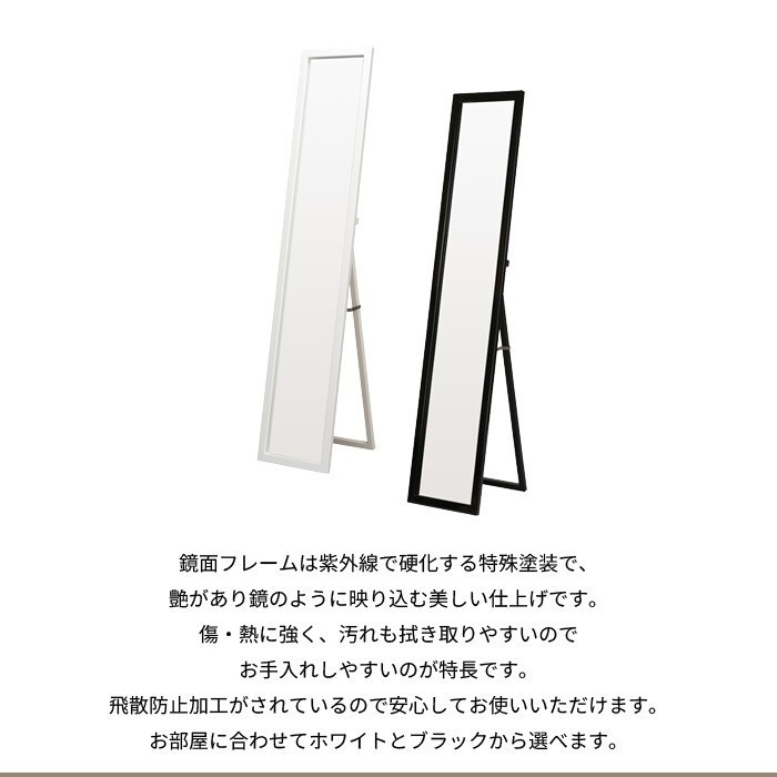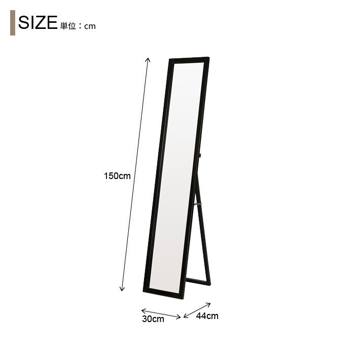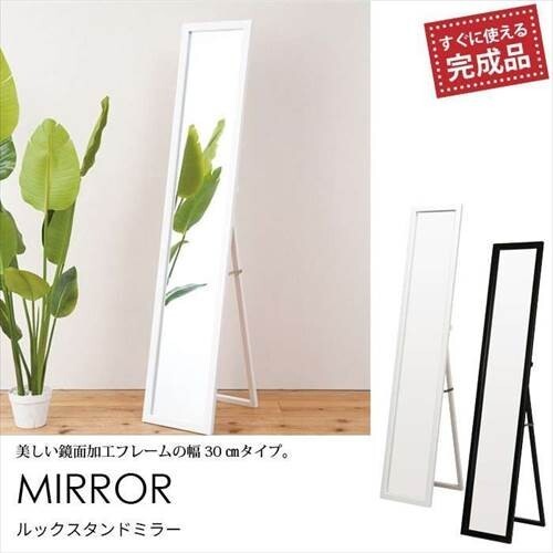 商品説明 | 美しい鏡面加工フレームの幅30cmのスタンドミラー。 【仕様】 ■サイズ:約幅30×奥行4~41×高さ150cm ■重量:約5.4kg ■材質:繊維板、ミラー(3mm厚) ■塗装:ポリウレタン樹脂塗装 ■カラー:ホワイト、ブラック ■機能:鏡面加工フレーム、飛散防止加工ミラー、折りたたみ可能 ■生産国:中国 ■組立区分:完成品 |