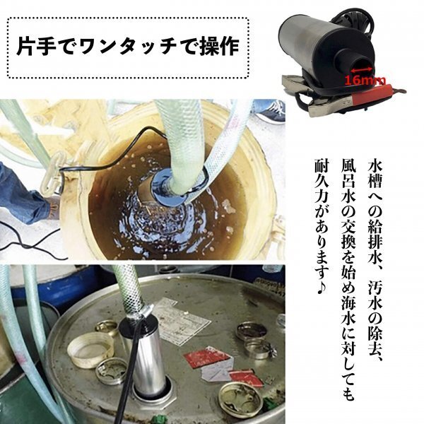 水中ポンプをお探しの方におすすめ!コンパクトで軽量ながら、驚きの毎分30Lの吸上げ力を誇るこのポンプは、さまざまなシーンで大活躍します。水槽への給排水から汚水の除去、さらには風呂水の交換に至るまで、幅広い用途に対応。耐久性の高いステンレス製ボディは、海水にも耐えるため、アウトドアやレジャーでの使用にも最適です。持ち運びも簡単なので、いつでもどこでもご利用いただけます。
