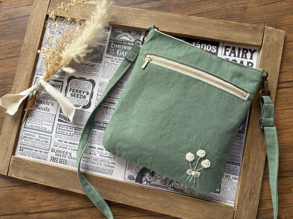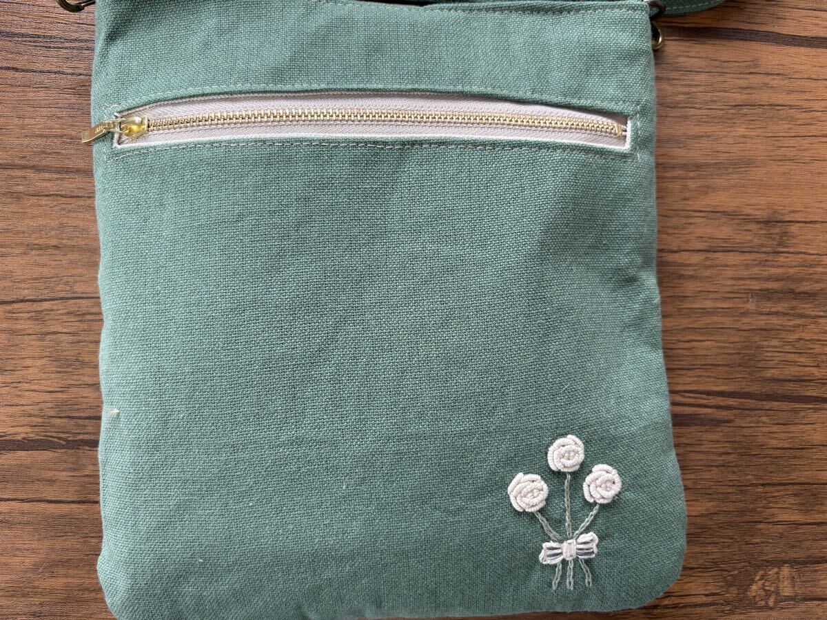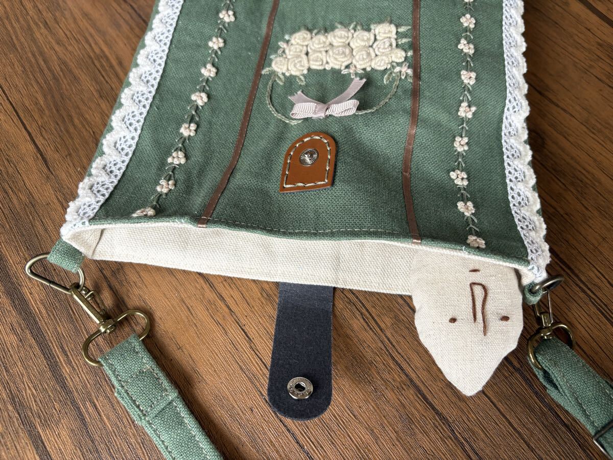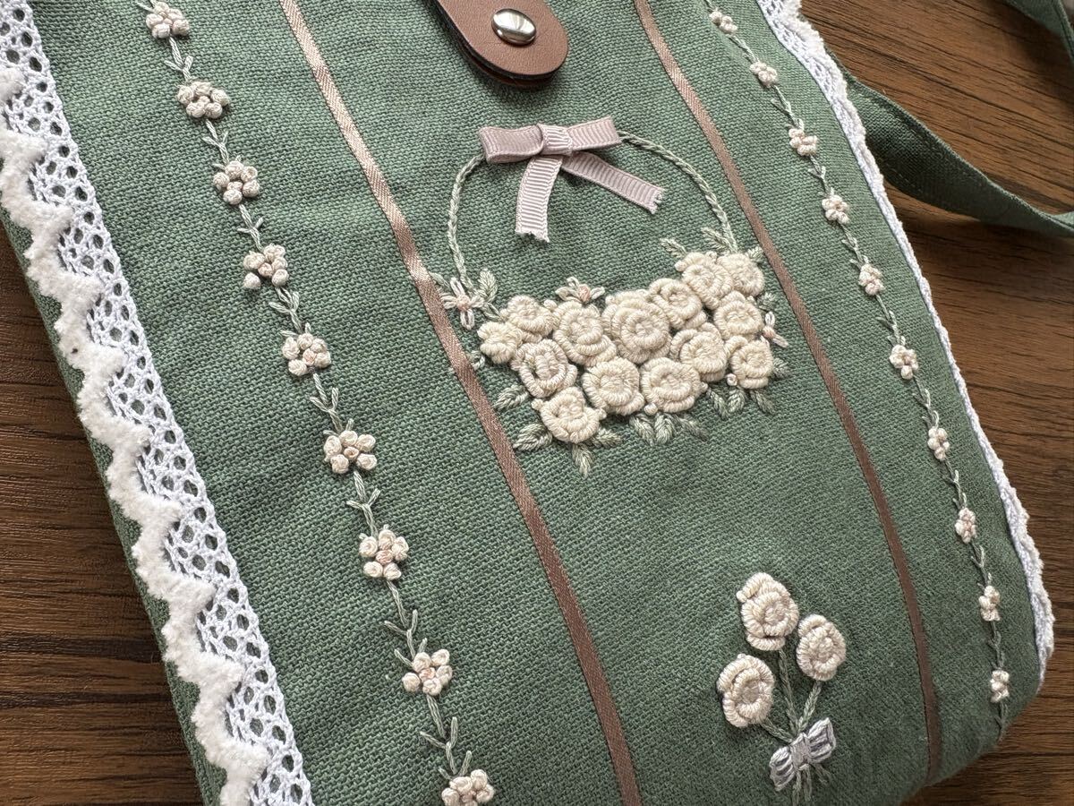 先染めのくすみグリーン生地に表、裏側に白バラや草花の手刺繍で仕上げました。