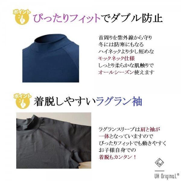 お子様の肌に触れるその商品、本当に大丈夫? 着替えも恥ずかしくない! ぴったりフィットでもサラサラでインナーが気にならない! シンプルさを追求し、日本国内でデザイン・監修した完全オリジナルなUHブランドインナー。 コンプレッションインナーとしてお子様のスポーツやトレーニングに力を発揮!筋力をサポートしてパフォーマンスを上げ、 筋損傷の回復効果があることを確認した研究から、疲労回復効果もあります。ユーエイチブランドの製品は日本国内の品質評価機構にて生地検査合格を取得。紫外線防止指数の測定値はUPF50+、紫外線遮蔽率は99.8%でお子様の日焼け防止効果も抜群です。吸汗速乾なスポーツインナーは長時間のスポーツでも快適に過ごすことができます。衿口はオールシーズン使うからハイネックより短めなモックネック。ハイマルチフィラメント糸を使用した生地は柔らかな肌触りで、夏冬問わず全シーズンに対応!肩と袖が一体となっている着心地のいいラグラン袖仕様のため、着るのも脱ぐのもカンタンで、ピッタリフィットでも4方向ストレッチ素材が動きやすくし、日常的に通学用や日焼け防止、防寒用インナーとしても使えます。 ■組成表示■ ポリエステル92% ポリウレタン8% ■使用環境■ 野球、サッカー、フットボール、フットサル、ラグビー、陸上、テニス、バスケットボール、バドミントン、バレーボール、卓球、ソフトボール、ジョギング、ランニング、トレーニング、スキー、スノーボード、ダンス、ヨガ、フィットネス、登山など、あらゆるスポーツに対応したコンプレッションインナーがお子様のパフォーマンスを向上させます。 本体とステッチが同色のため、公式戦にも対応してます。 ※ご利用のパソコン、モニター環境によって、画像の色味が異なって見える場合がございます。予めご了承下さい。 | ||