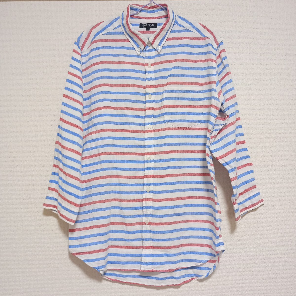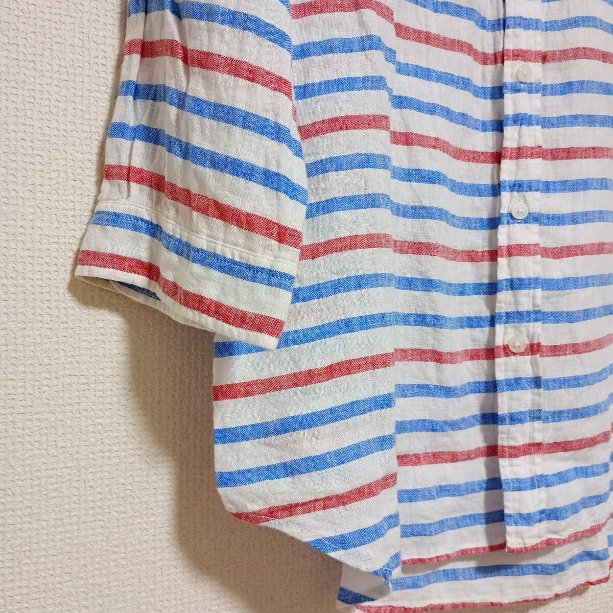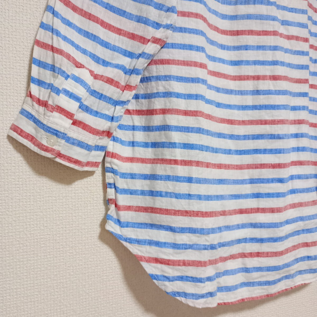 商品名 : ボーダーデザインリネン8分袖ボタンダウンシャツ