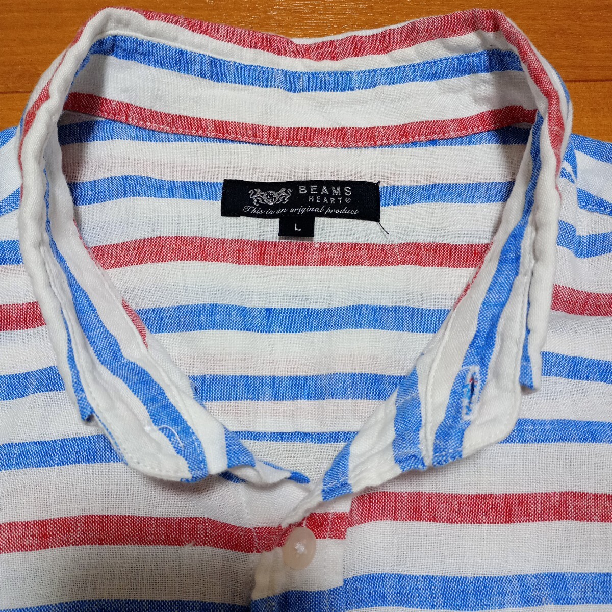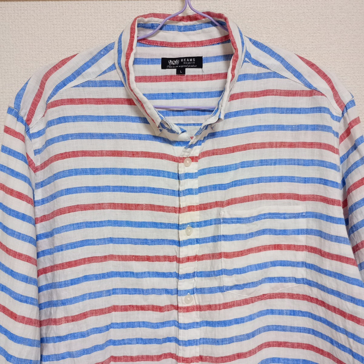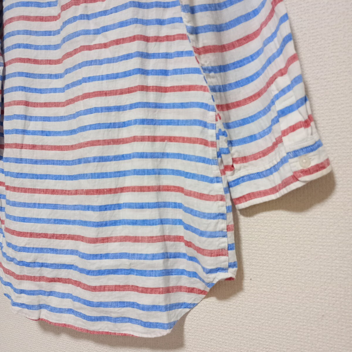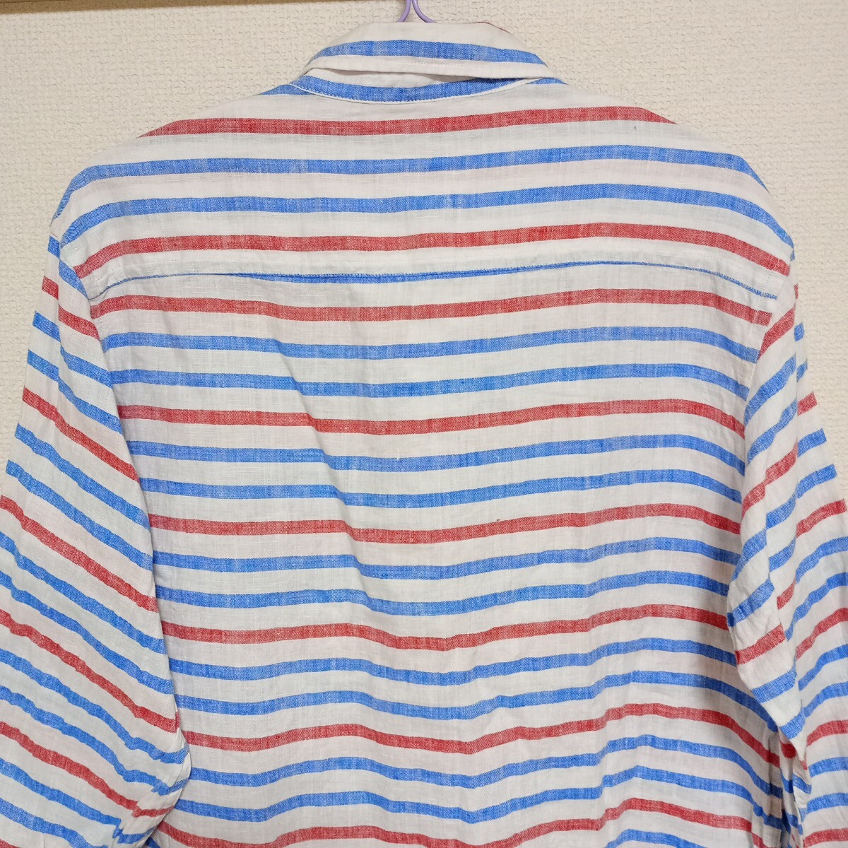 商品名 : ボーダーデザインリネン8分袖ボタンダウンシャツ