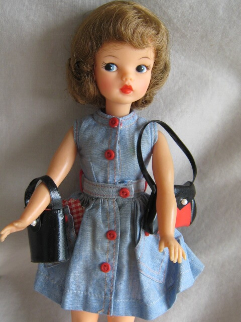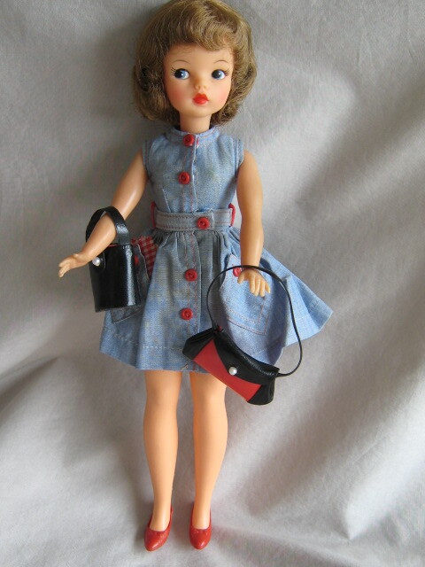 タミーちゃんの夏のお洋服セットです。水色のワンピースと共布のベルト、紅白のギンガムチェックのハンカチーフ、黒と赤のツートーンカラーのバッグ2種類、赤いハイヒールが付属しています。モデルの人形は含まれません。