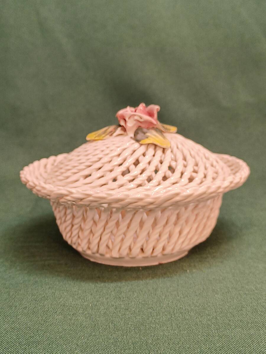 イタリア製 キャニスター キャンディーボックス 陶器カゴ かご 薔薇 花  置物 小物入れ レトロ ビンテージ アンティーク◇B-124