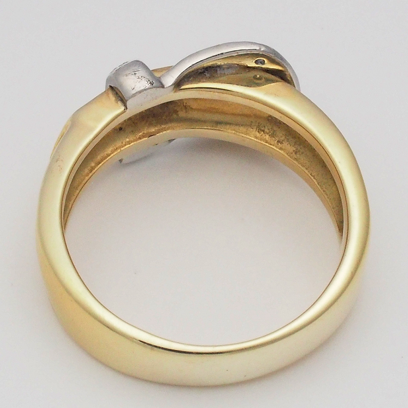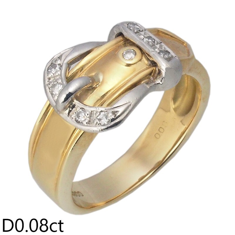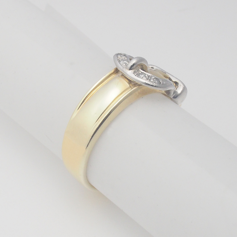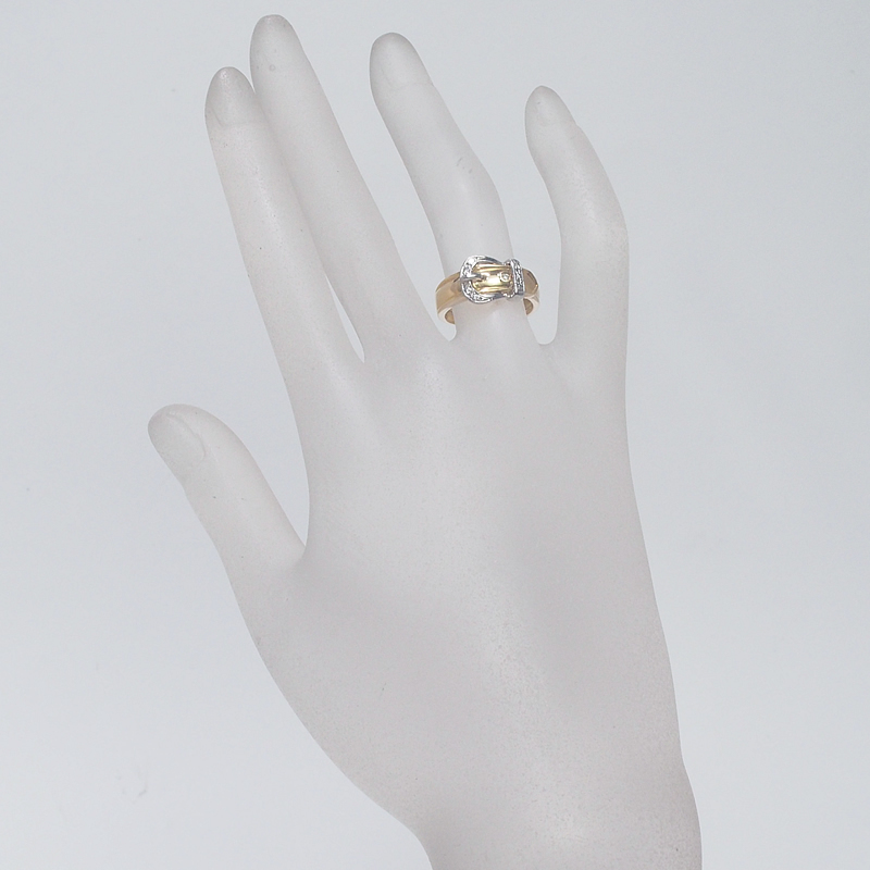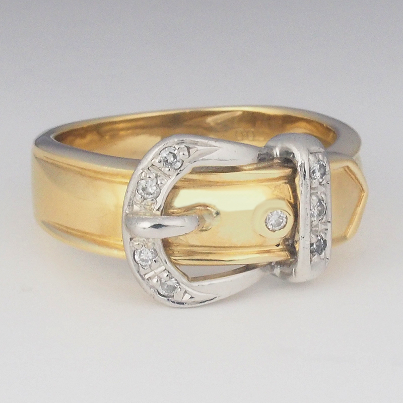 ベルトモチーフに煌めくダイヤモンドとプラチナで飾り立てたイエローゴールド製のリングです。