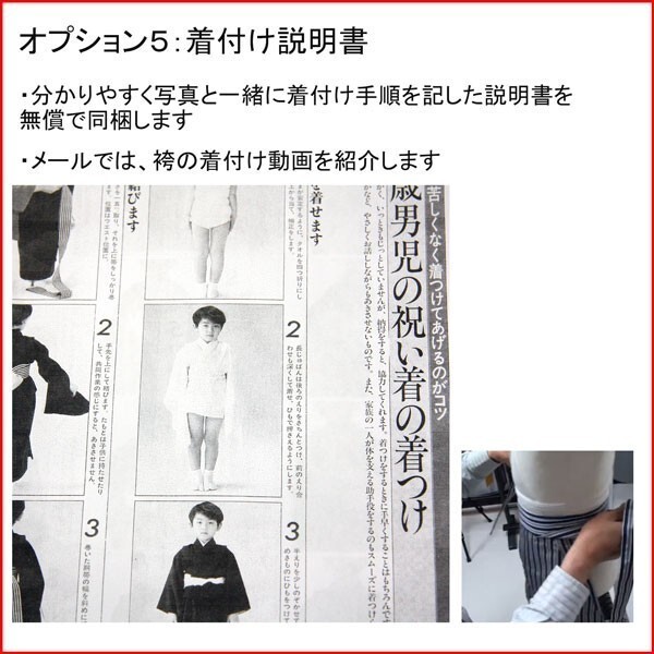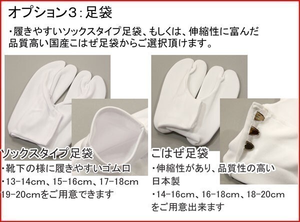 腰紐 足袋 草履交換 着付け説明書 | ■足袋は2種類からご用意 1.ソックスタイプの足袋:別途¥580 17~18cm 19~20cm 2.こはぜ付本格足袋(日本製):別途¥1500 17~18cm 19~20cm ■男児用腰紐:別途1本¥240 ■草履は16.5cm、19cmに変更することができます。 (サイズ変更された場合、白の草履に変更になります) ■「着付け」説明書をお付けいたしております。(無料) ※ご要望のお客様は、「フォーム備考欄」「メール(aji_net@khaki.plala.or.jp)」「お電話」「FAX」いずれかの方法でご連絡ください。 |