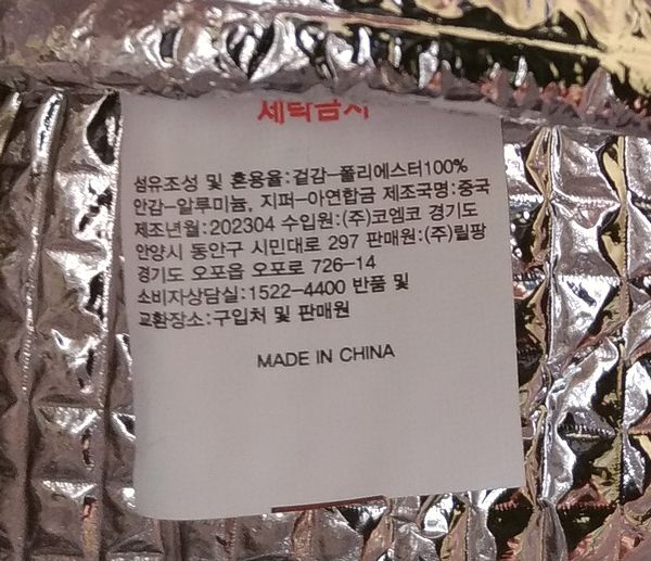 タグは韓国語(ハングル文字)なので私は読めません。中国製です。