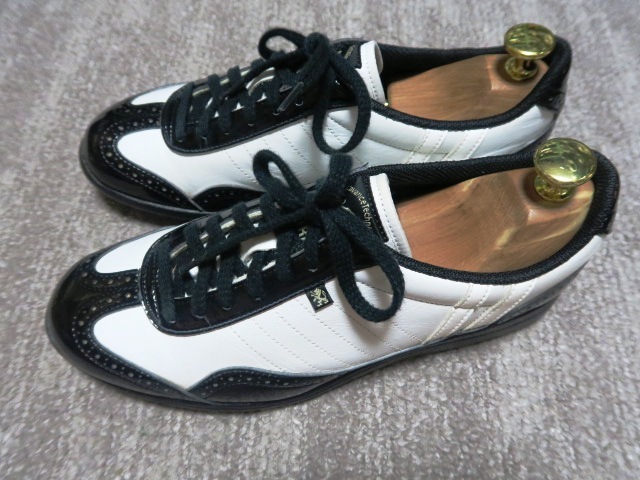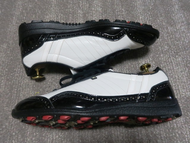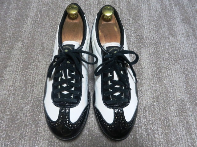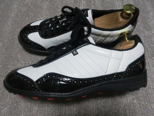 2.7万 国産 美品 パトリック PATRICK GOLF カップ レザー レディースゴルフシューズ スパイクレス 38/24cm 日本製 黒 白 本革