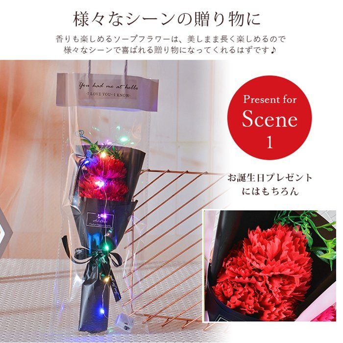 LEDライト付き ソープフラワー カーネーション 枯れない花 花束 3輪 LED イルミネーションライト フレグランス ブーケ 花 造花 石鹸花 プレゼント ギフト 母の日 誕生日 贈り物 結婚記念日 バレンタイン 退職祝い 送別会 結婚祝い 卒業祝い 入学祝い 開店祝い 引越し祝い 新築祝い お見舞い 就職祝い かわいい