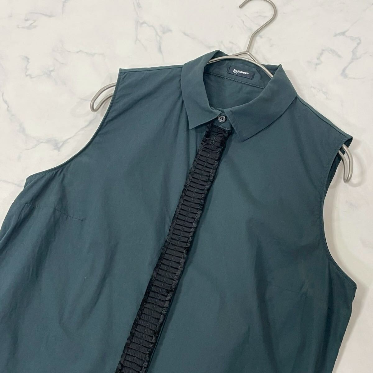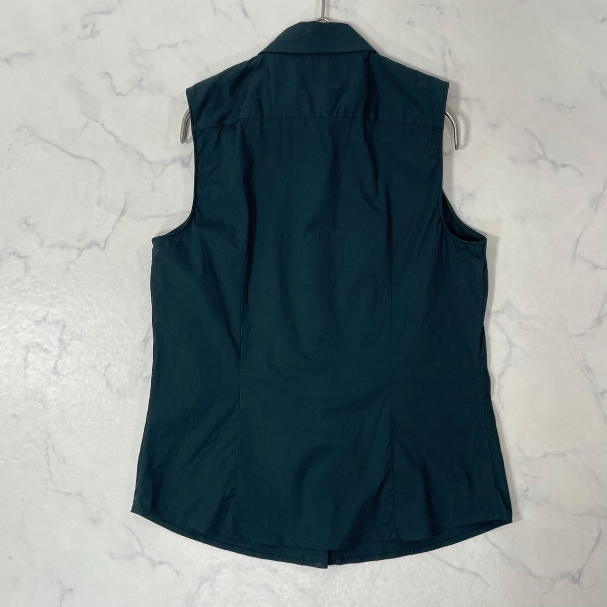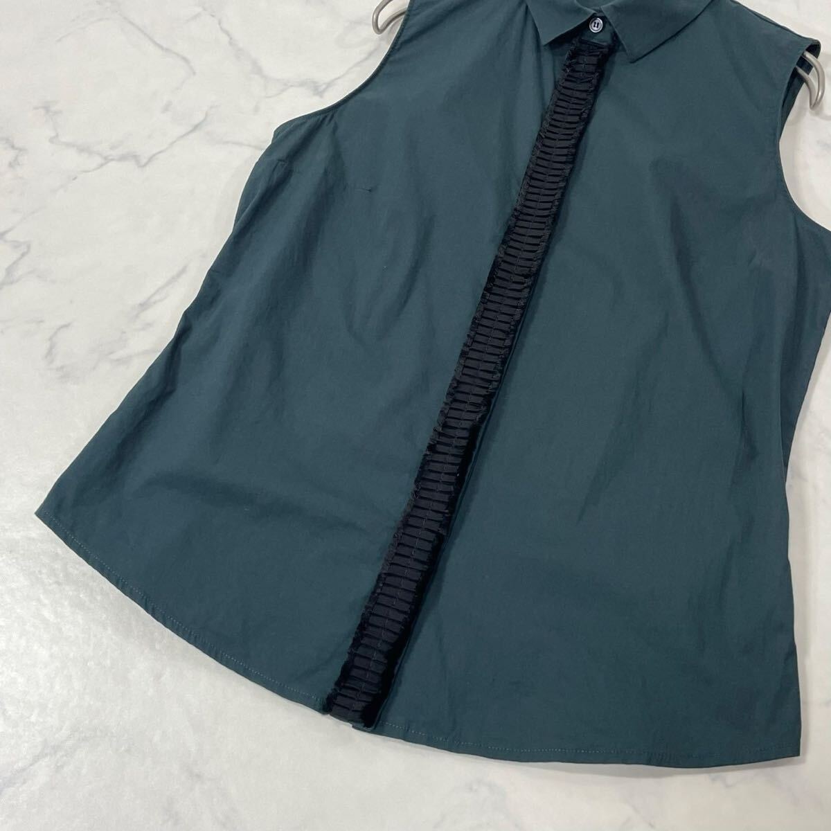 イタリア製 切替 異素材 フライフロント リボン ダーツ シャツカラー ノースリーブ シャツ ブラウス