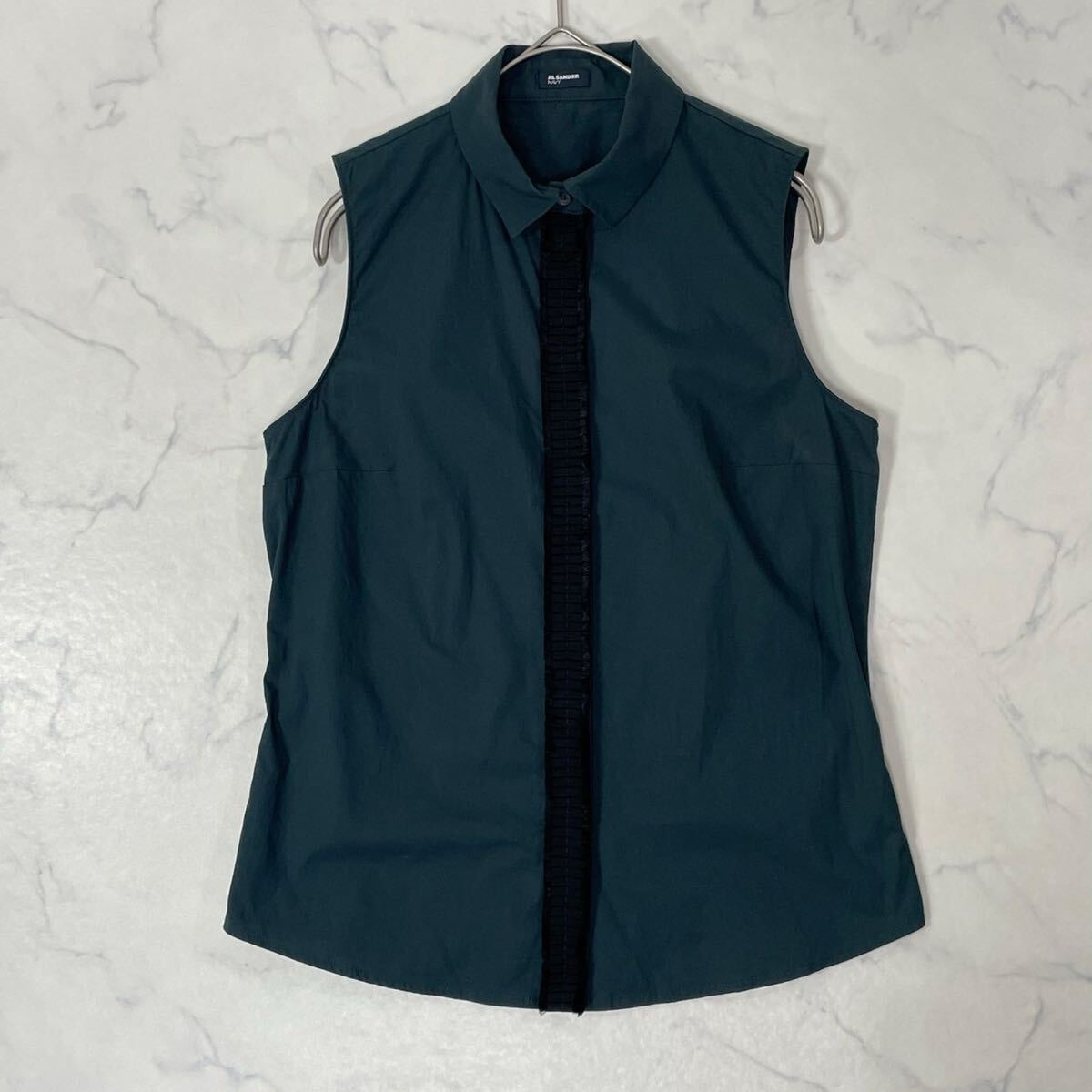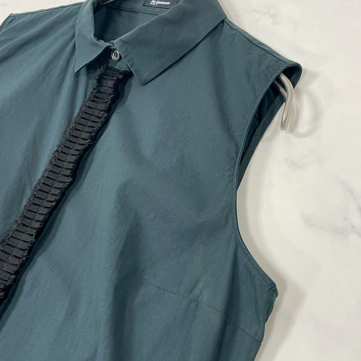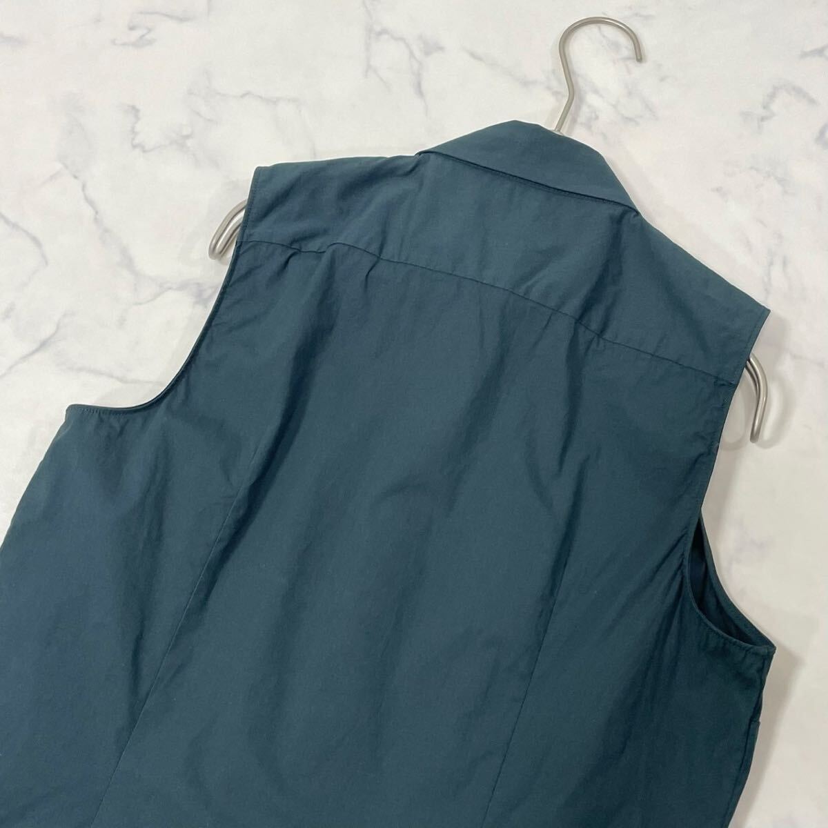 イタリア製 切替 異素材 フライフロント リボン ダーツ シャツカラー ノースリーブ シャツ ブラウス
