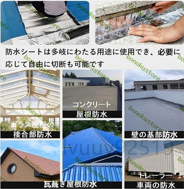 【特徴2】粘着層付改質アスファルトシート(1m幅)は、大面積に貼り付けることができ、また、必要なサイズに美工ナイフで切り裁ち、漏水箇所を修復することもできます。(注意:切り裁ちのサイズが漏水箇所の2-3倍以上の大きさであることです。)