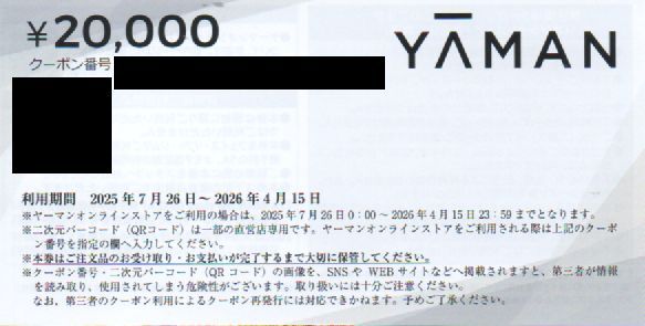 ヤーマン 株主優待券 20000円分 有効期限:2026年4月15日 番号通知 送料無料