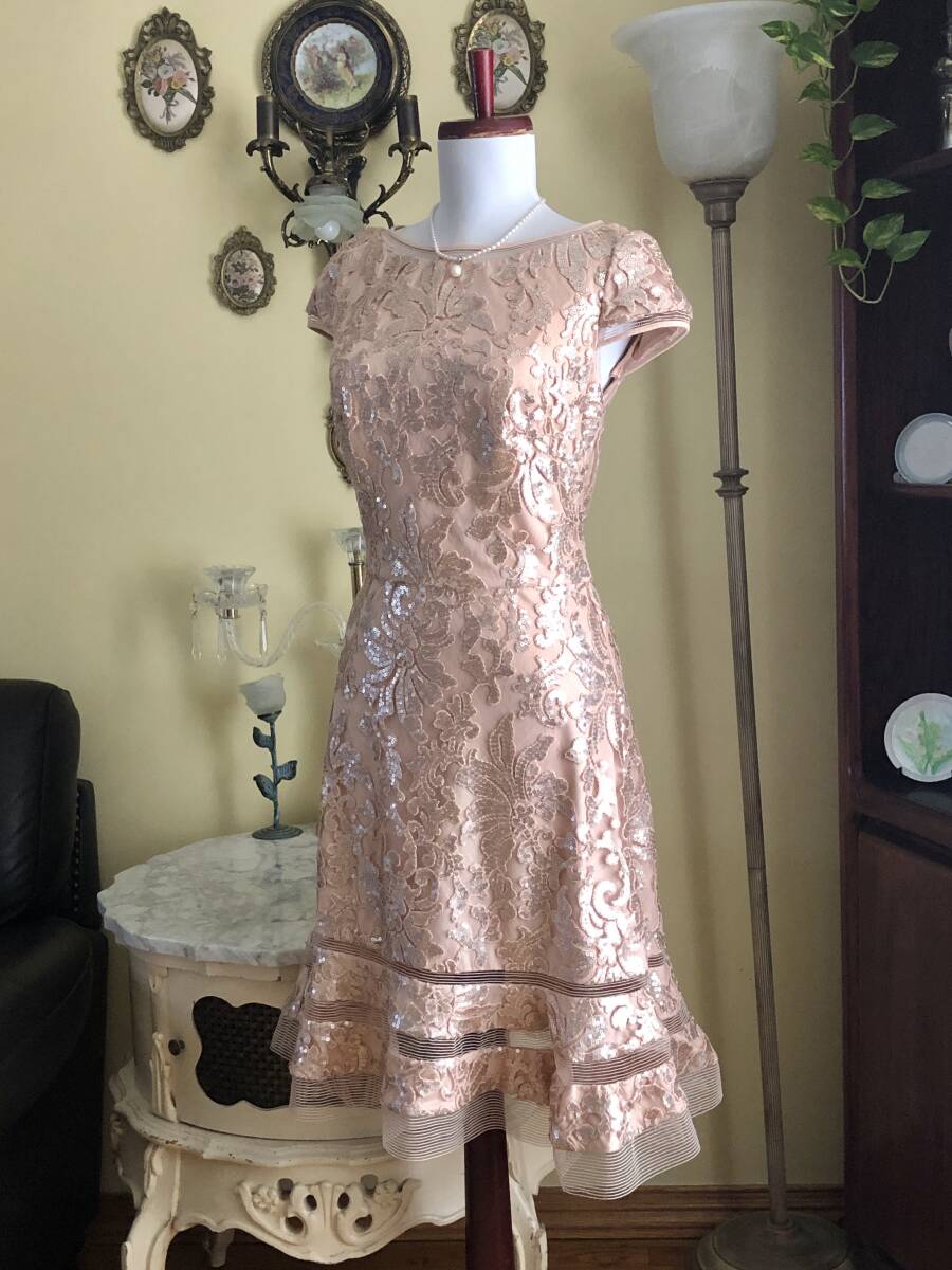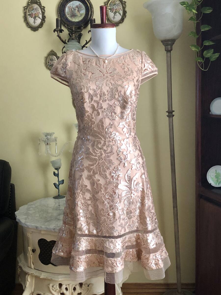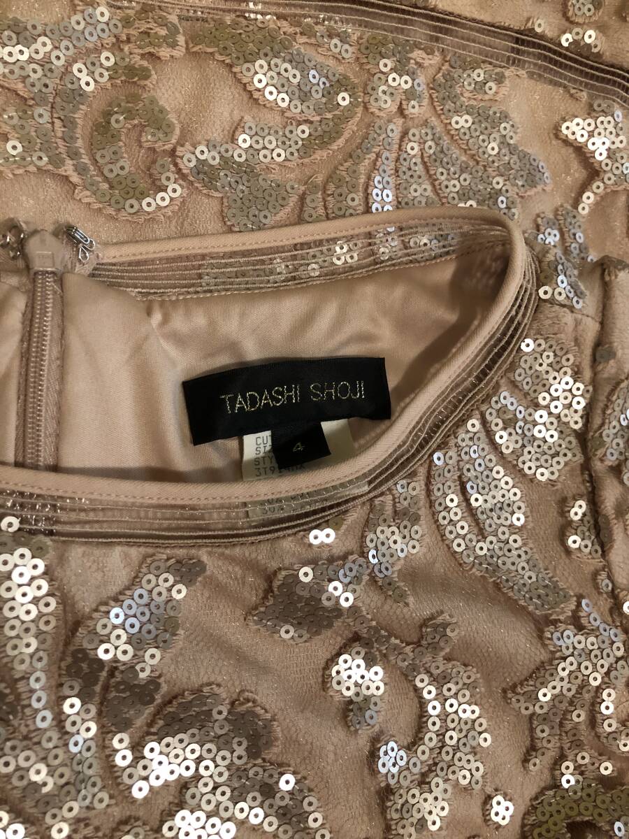 | 【状態】中古 綺麗なお品です。 【ブランド】TADASHI SHOJI 【サイズ】表示サイズ/us(アメリカ)4 日本対応サイズ目安/ 9号Mサイズぐらい *個人差がございます。必ず採寸をご参照ください。 【採寸】平置き採寸です。 肩幅36㎝、身幅44㎝、ウエスト37cm、着丈100㎝(上身丈40㎝+スカート丈60㎝) 【カラー】ピンクベージュ 【素材】ナイロン40%、コットン30%、ポリエステル30% 【裏地の素材】ポリエステル100% 【着脱】後ファスナー