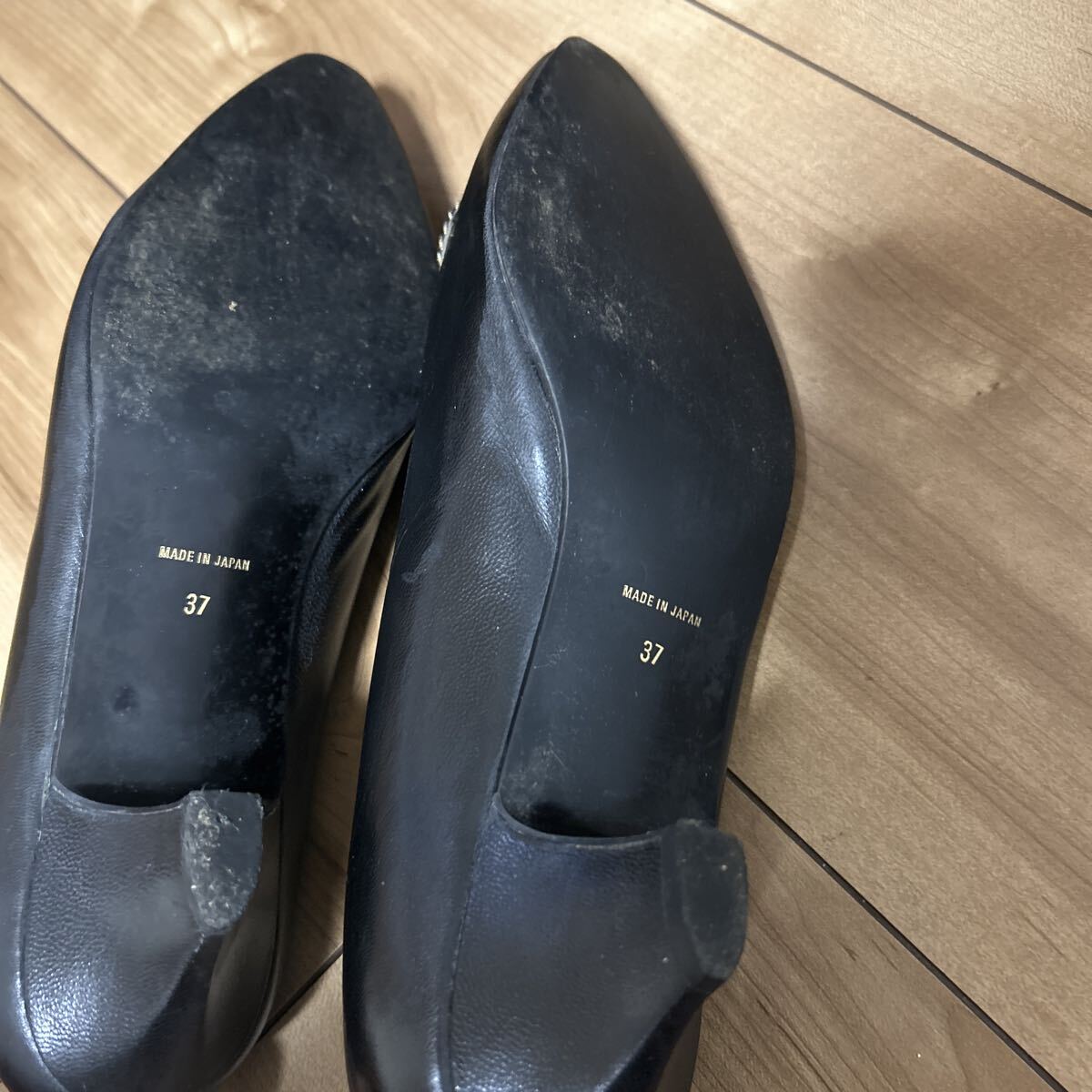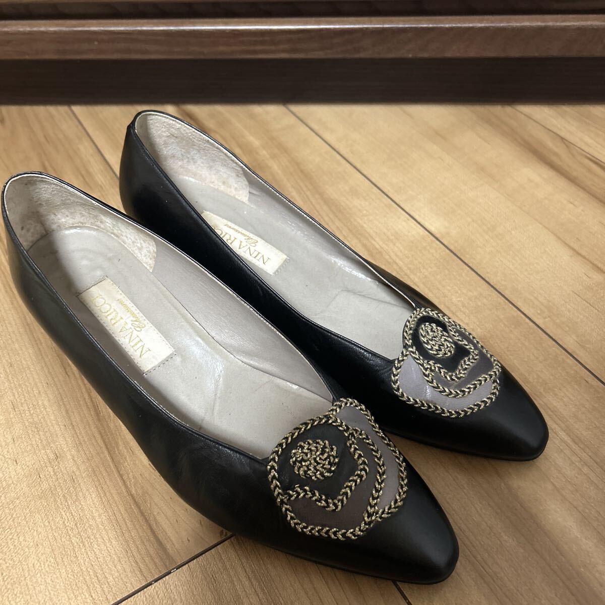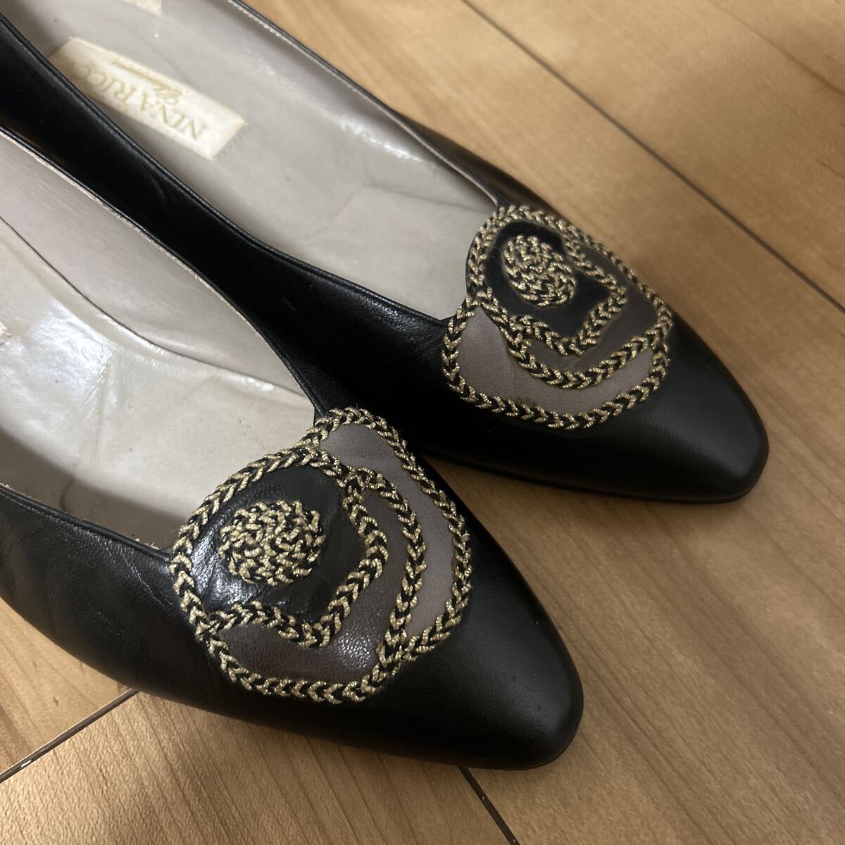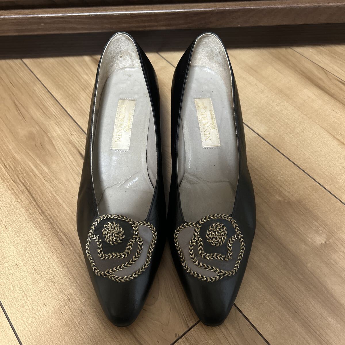 黒のレザー製パンプス、フラワーモチーフのゴールドの装飾が特徴。