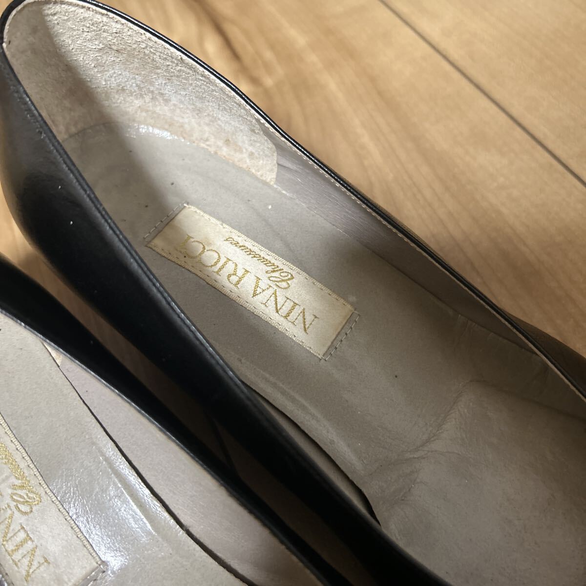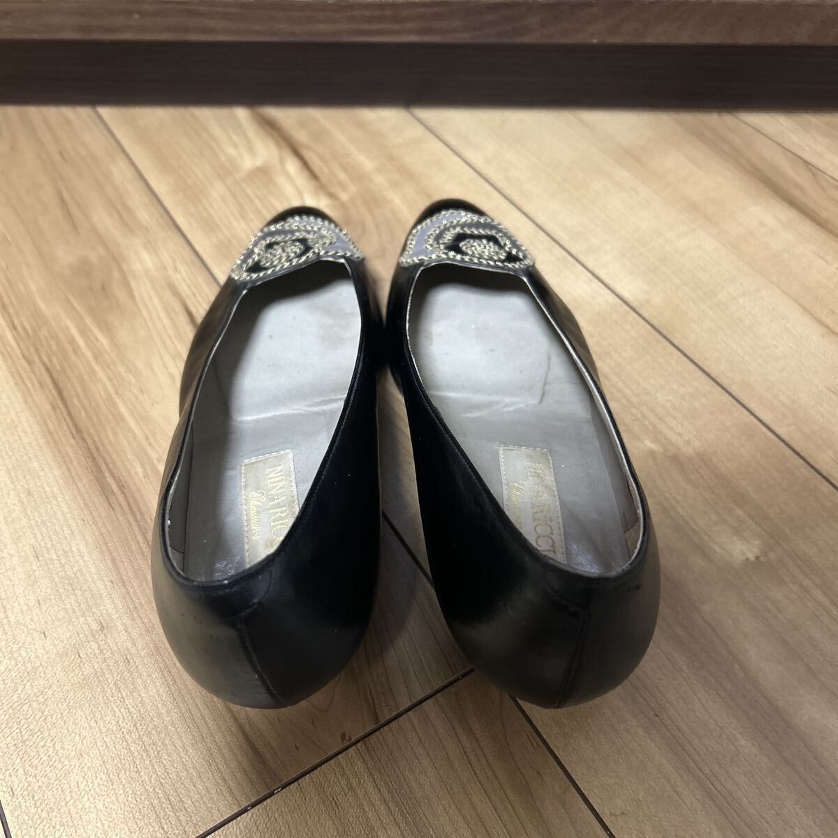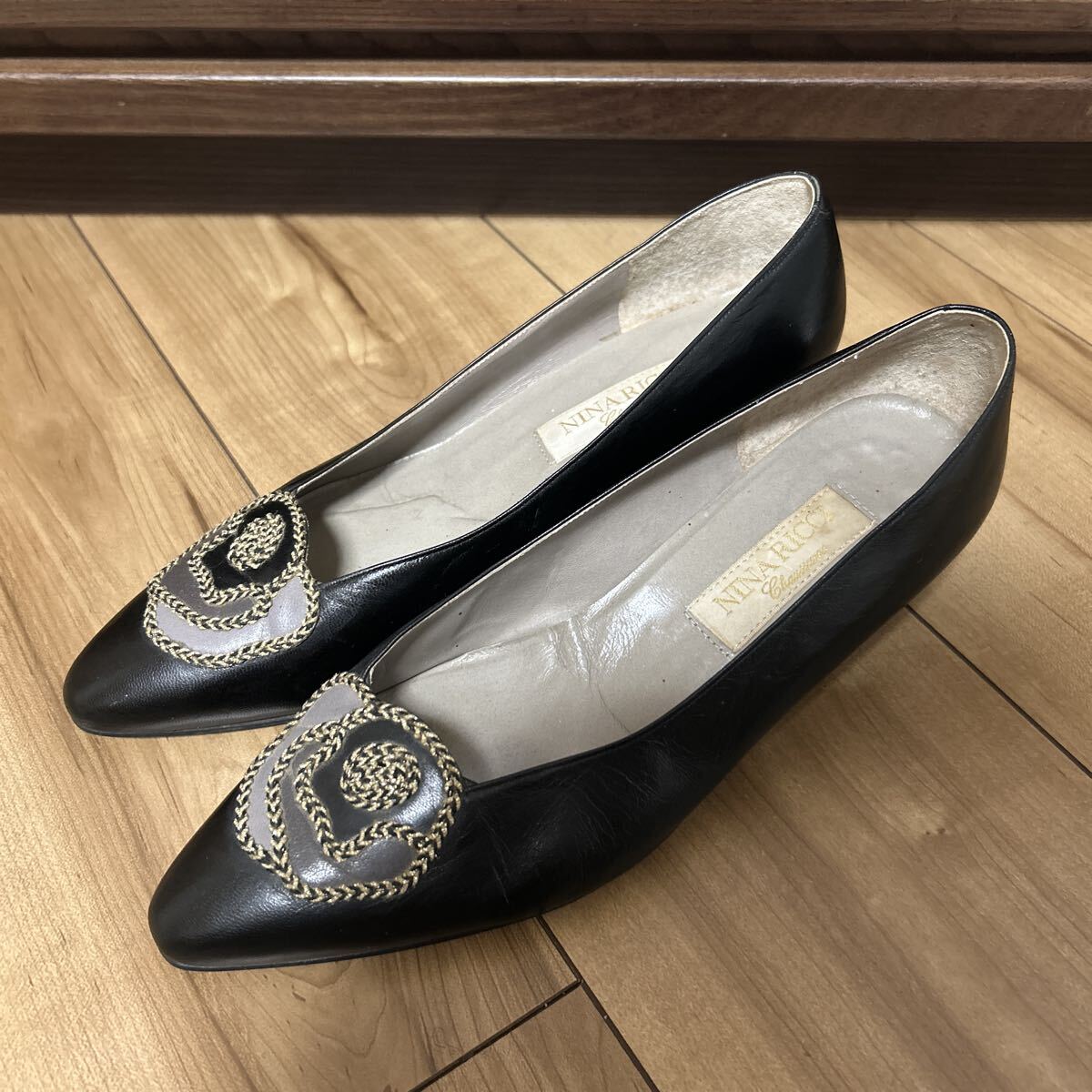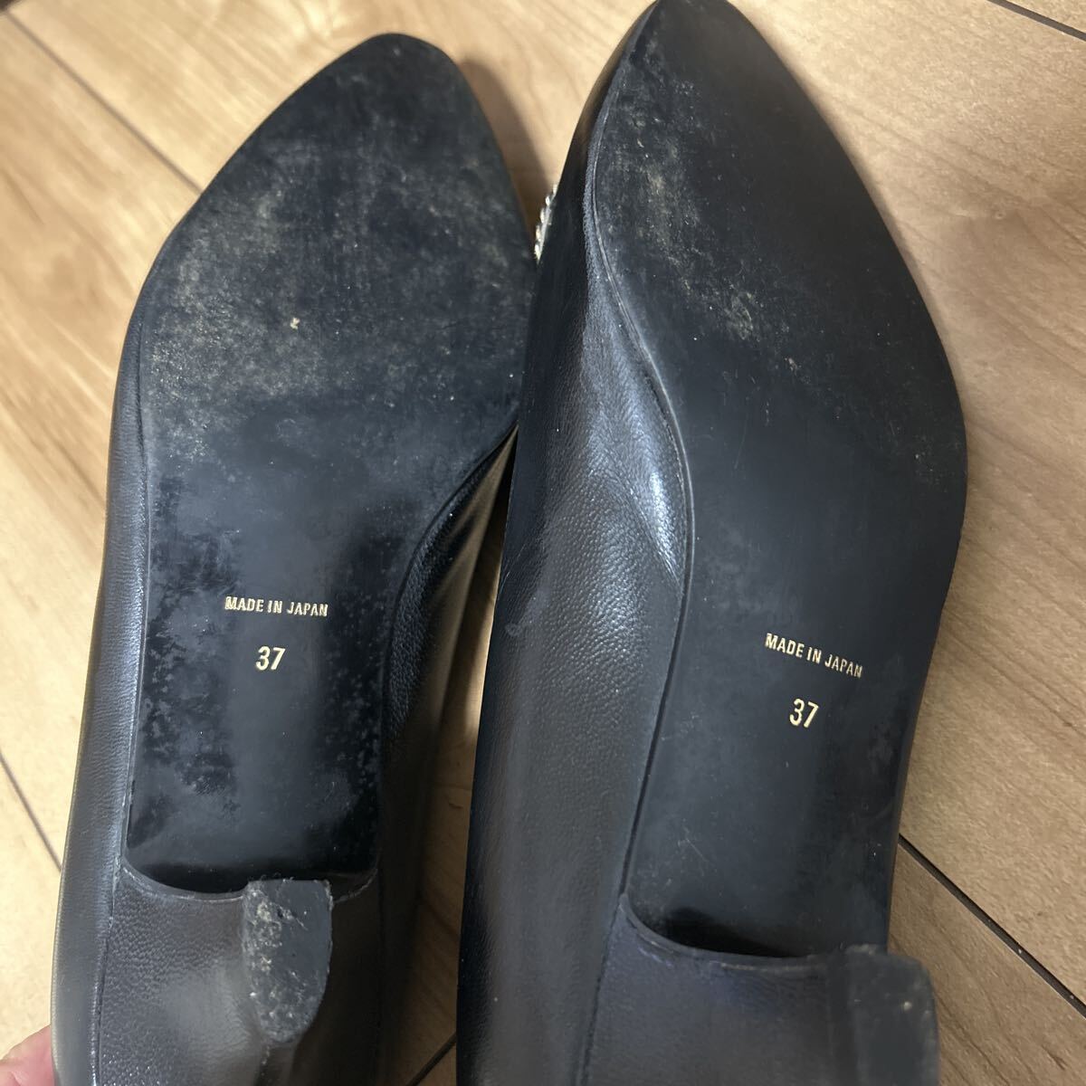 黒のレザー製パンプス、フラワーモチーフのゴールドの装飾が特徴。