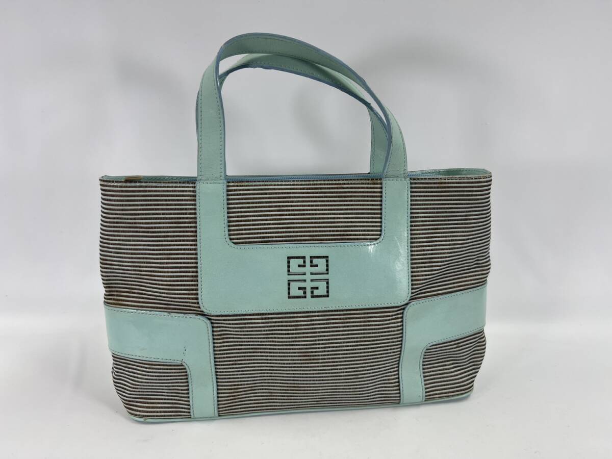【GIVENCHY】スペイン製 ハンドバッグ トートバッグ ストライプ キャンバスレザー 水色 サックス色 ジバンシー