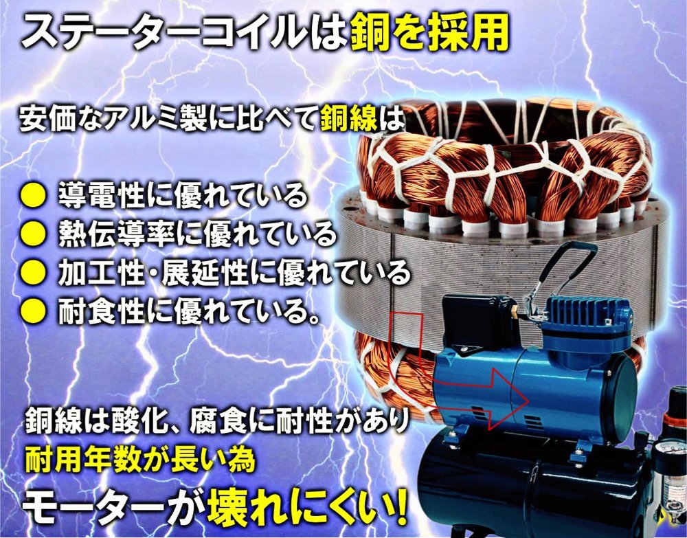 ・サイズ(約):本体 L310×W130×H310 mm ・電源コード:約1.8m ・馬力:1/5HP 消費電力150w ※注意 連続作業時間は20分以内となっております。 電源:AC100V(50/60Hz) 最大空気圧:4.0kgf/c〓 タンク容量:3L エアー吐出量:20~23L/min 騒音値:低騒音45db 付属品:エアーホース(1/8 BSP 約3.0m) エアーレギュレータ/ウォーターセパレーター(圧力計付) 3Lエアータンク付きオイルレス 小型エアーコンプレッサーの特徴 タンクが付き、安定したエアー供給が可能になりました。 長時間使用時などのポンプ連続運転時間が軽減され耐久力大幅UP  ネイルアート やエアーブラシ 作業など、屋内使用も可能なコンパクトタイプ! 付属のエアーレギュレーター/ウォーターセパレーター(圧力計付)でエアー圧調整も楽々! 静音設計のピストン式採用で、約45dbの低騒音を実現! 圧力が約4.0kgf/c〓時に自動停止、3.0kgf/c〓時に再起動する安心 便利な設計です  3Lタンクには安全弁(セーフティーバルブ)付きで安心  エアー吐出口及び付属のホースは1/8 BSPとなっております。  通常の1/4"タイプのホース、エアーツールは接続出来ませんので別途1/8"~1/4"への変換アダプターをご用意下さい。