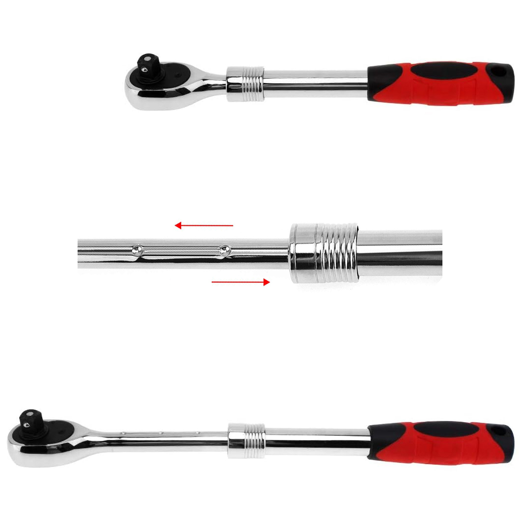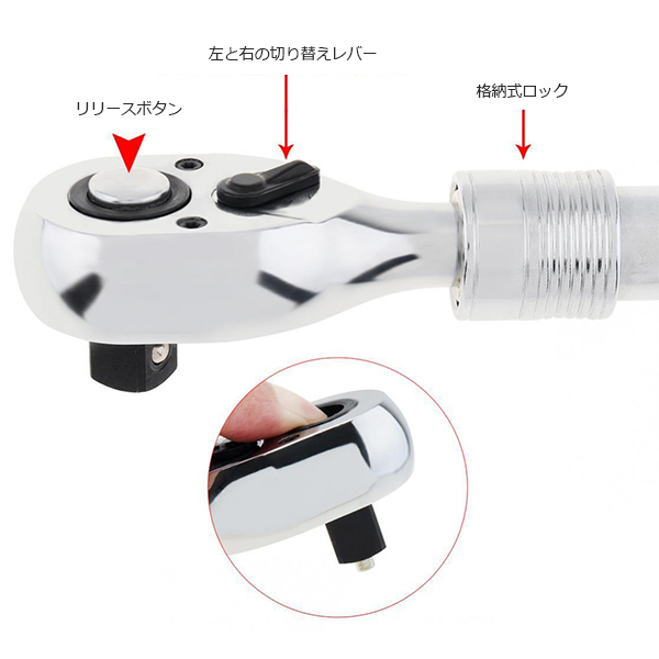 商品詳細 | ハンドルが5段階に伸縮し、通常の使用では縮めた状態で、大きなトルクが必要なときは伸ばして使用することができるラチェットレンチです。 伸縮式のためコンパクトに収納でき、携帯にも便利です。 72山ギア採用で狭い場所でも小さな振り幅で作業が可能です。 プッシュ式クイックリリース機構でソケットの素早い取り外しが可能です。 これ1本で長短2役をこなし工具箱のスペースが節約できます。 ■商品仕様 ・差込角: 3/8"(9.5mm) ・歯数:72ギア ・全長: 225、250、275、300、330(mm) ・ヘッド部厚さ×幅: 20×32(mm) ・重量: 450g |