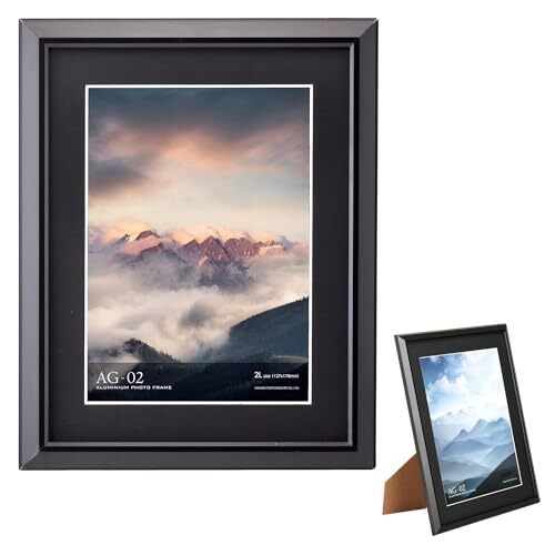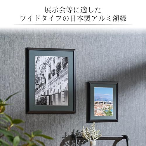 展示会等に最適なシンプルでシャープな印象のアルミ額縁 直線的でシャープな印象のアルミ製額縁です。シンプルでモダンなイメージは展示会をはじめフォーマルな用途に最適です。 Vカットの中抜き加工より、額に奥行き感を与え、作品をより引き立たせます。(Vカットとは、中抜きの断面を斜めに断裁する加工方法です。) 前面板は、2L、6切、ワイド6切、4切、ワイド4切、A4サイズはガラス板を使用、 半切、全紙、A3、A3ノビサイズにはアクリル板を使用しています。 2L、6切、A4サイズは背面にスタンド付き。吊りヒモは全サイズに付属しています。