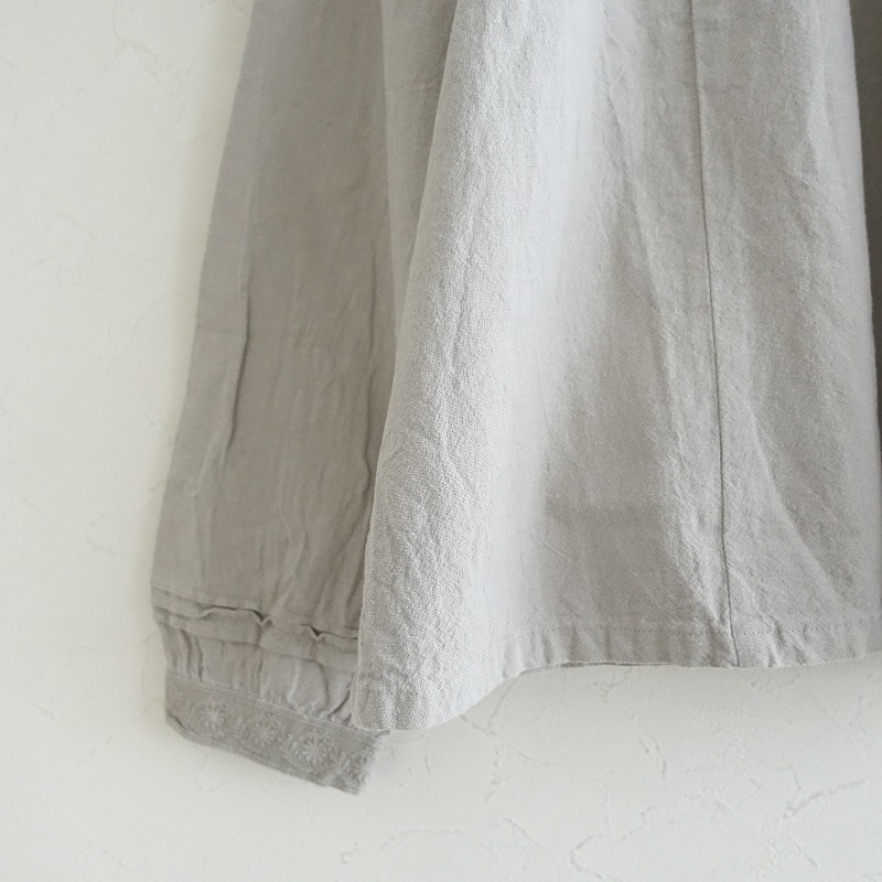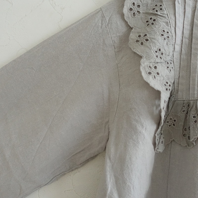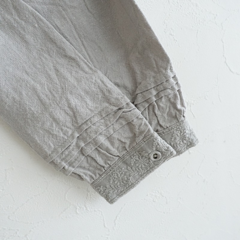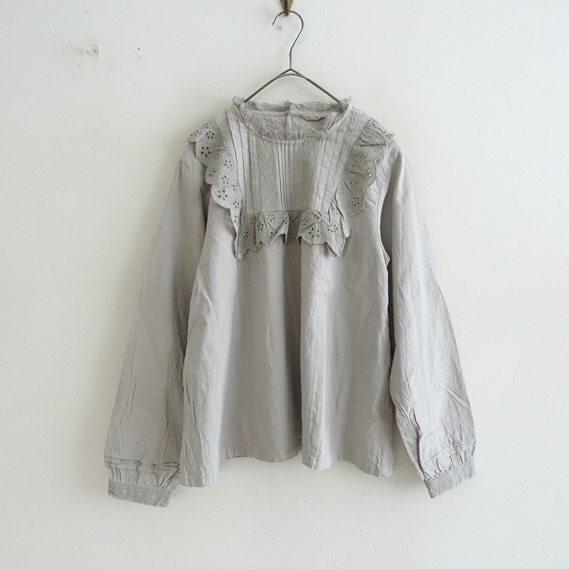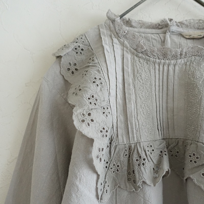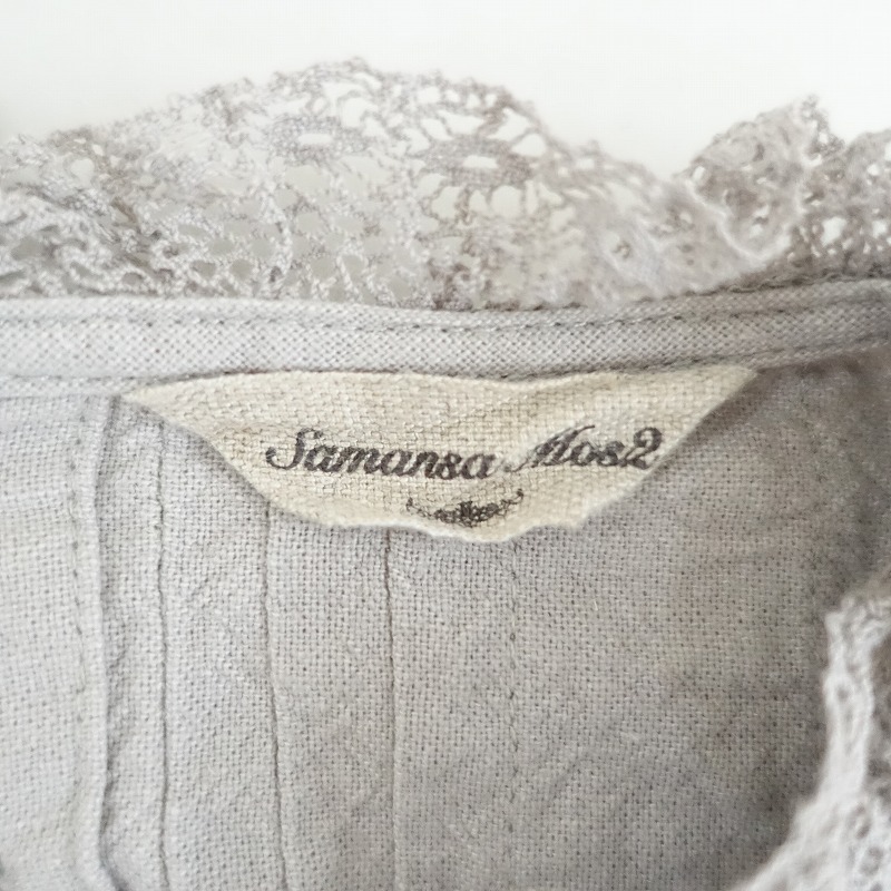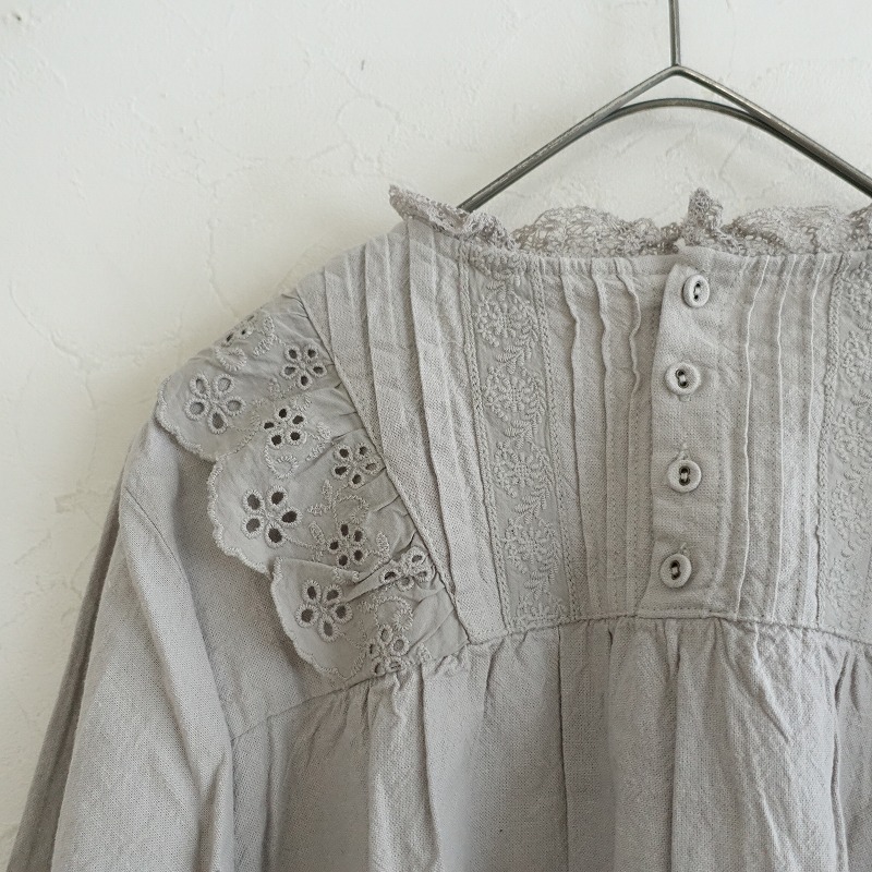 Samansa Mos2 のスカラップレーススモックブラウスです。カラーはグレーです。綿麻の通気性の良い程よい厚みの生地を使用。うっすら透け感がございます。背部4ボタン開きのプルオーバー仕様です。レースのスタンドフリルカラーで、ヨークや袖口にピンタックやレーステープ、スカラップのフリルなどがあしらわれ、ヨーク下と袖口にはギャザーが施されております。ポケットはございません。 |