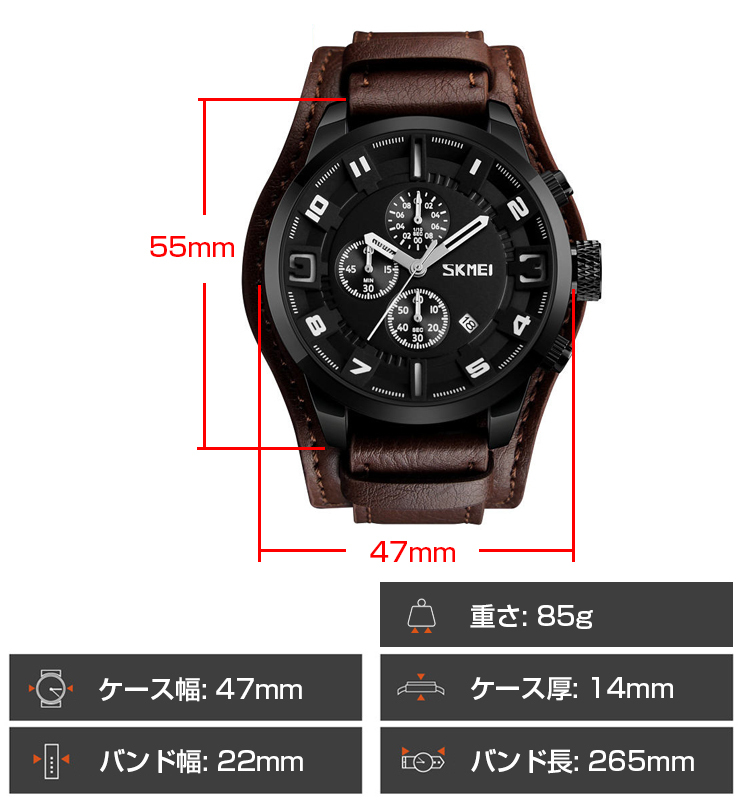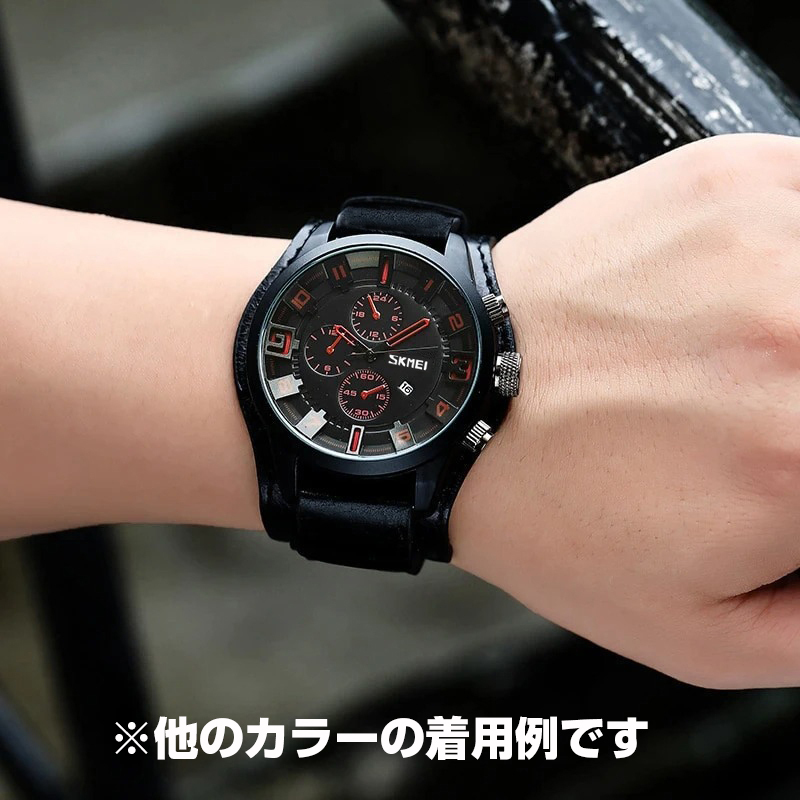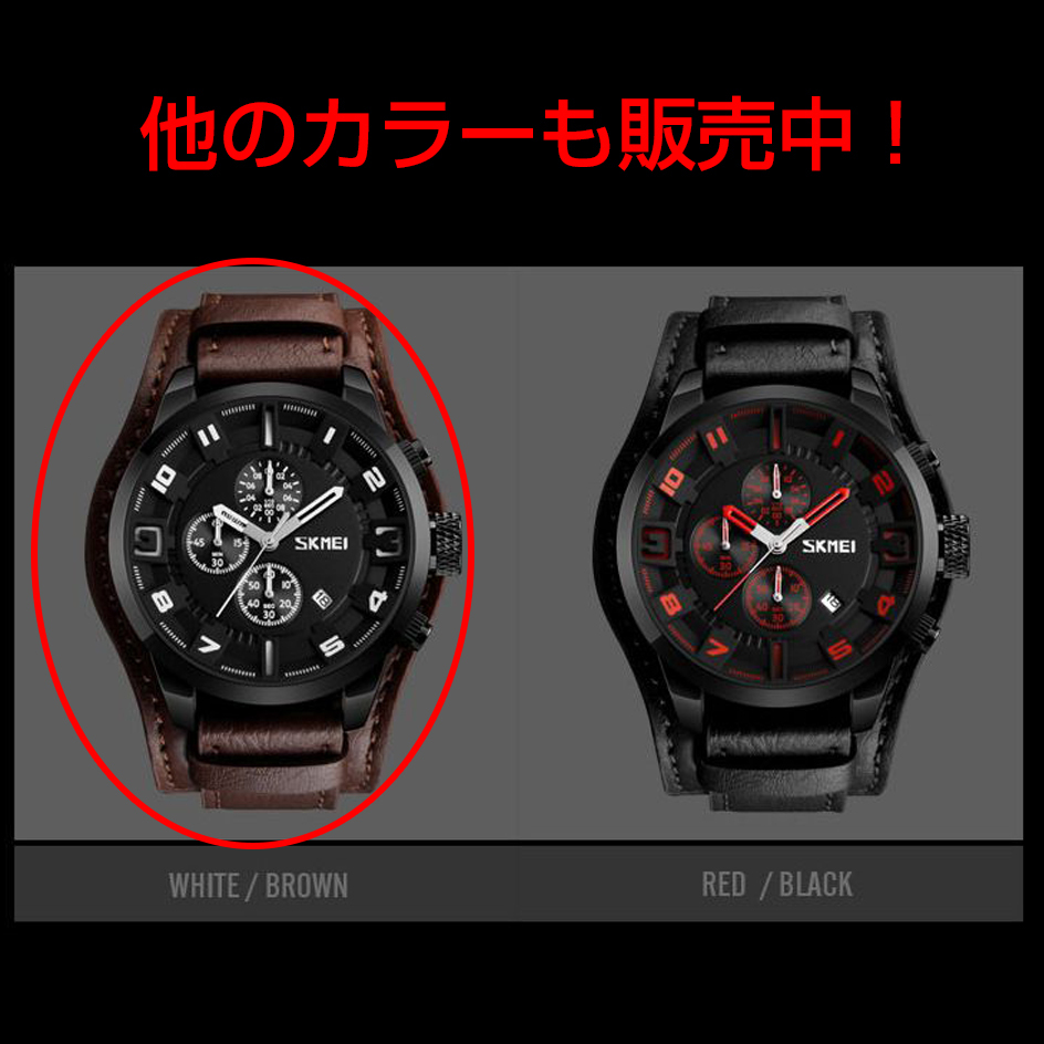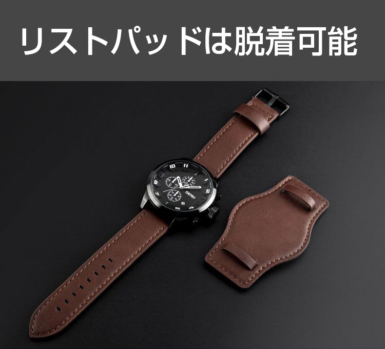 SKMEI社 新品クロノグラフ腕時計 30m防水ブラウンレザー本革ブラック 日付 ストップウォッチ スポーツ ビジネス カジュアルリストパッド