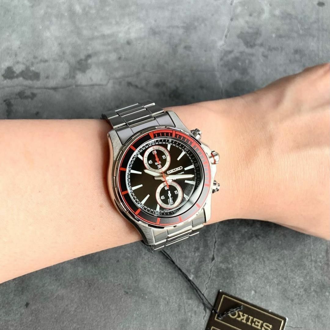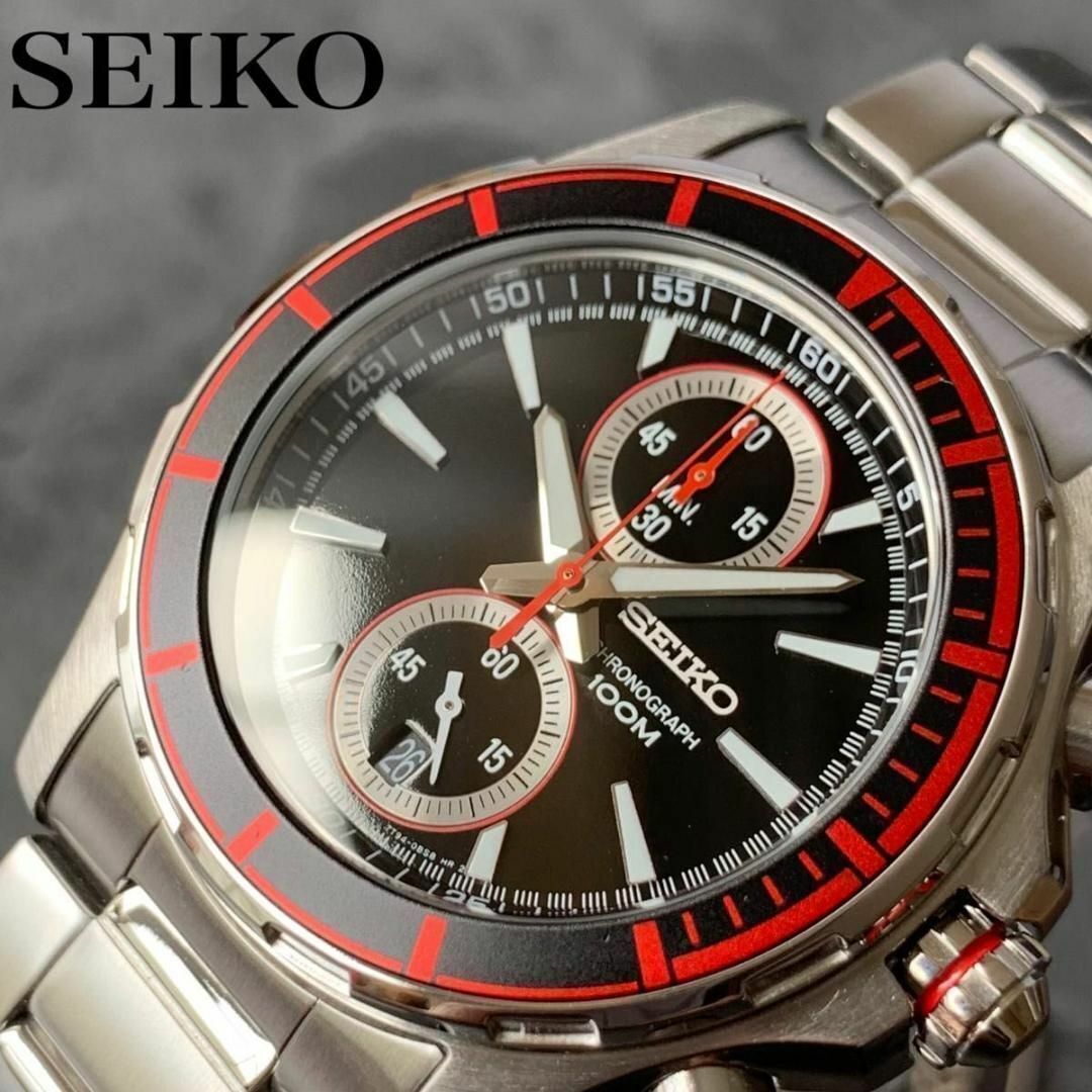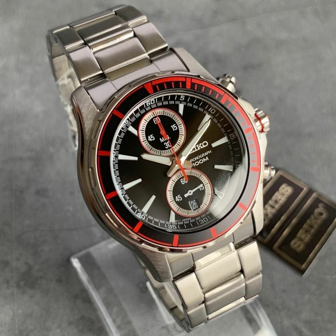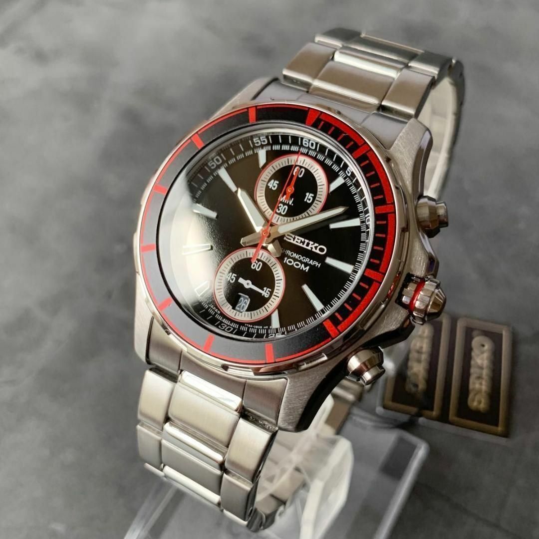 シルバー×ブラックにレッドのアクセントが効いたクロノグラフウォッチ。