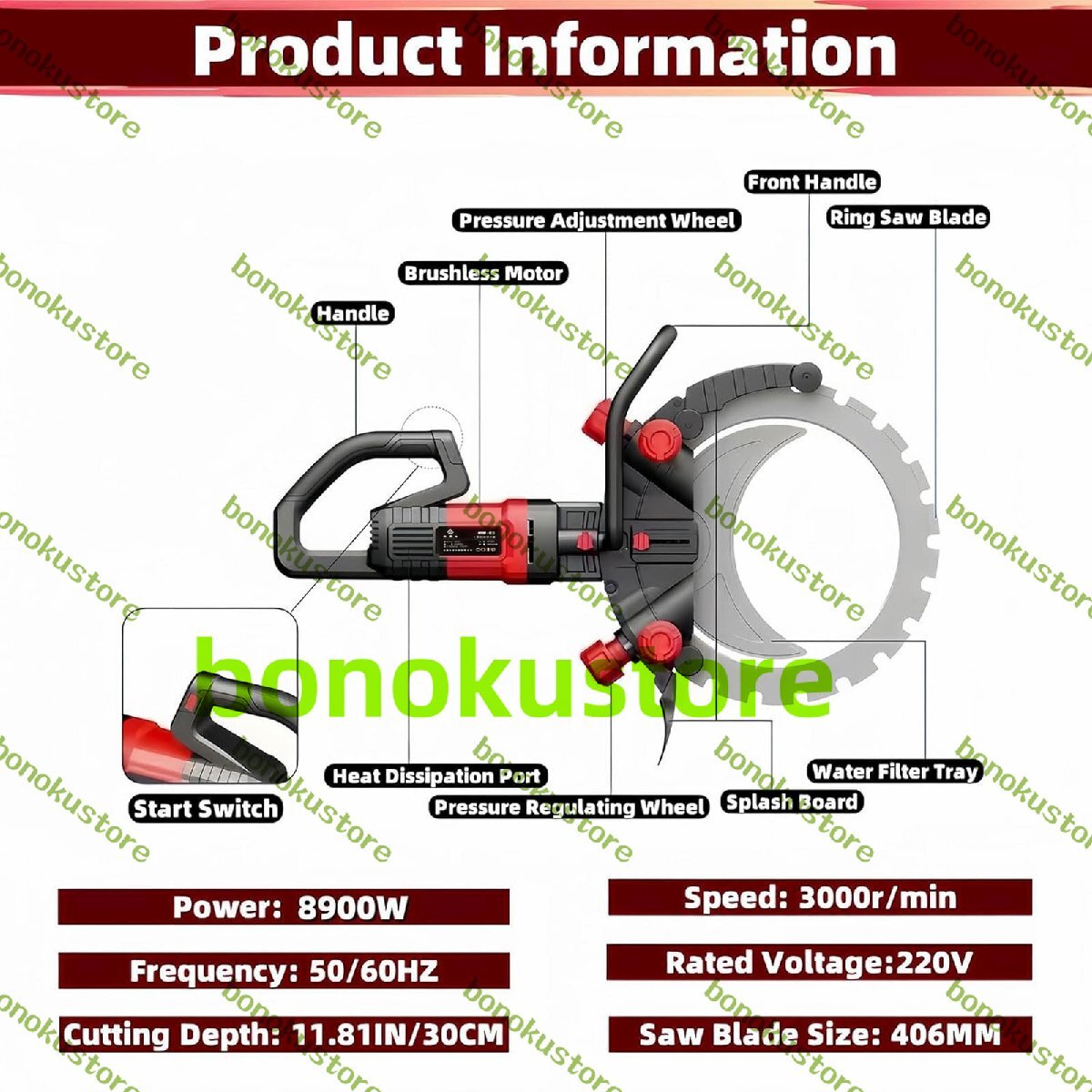 電動コンクリートソー、16インチアップグレードハンドヘルドコンクリートリングカッティングソー、給水式ダスト抑制機能付き、8900W高出力、切断深さ11.81インチ、石材、鉄筋、レンガ用