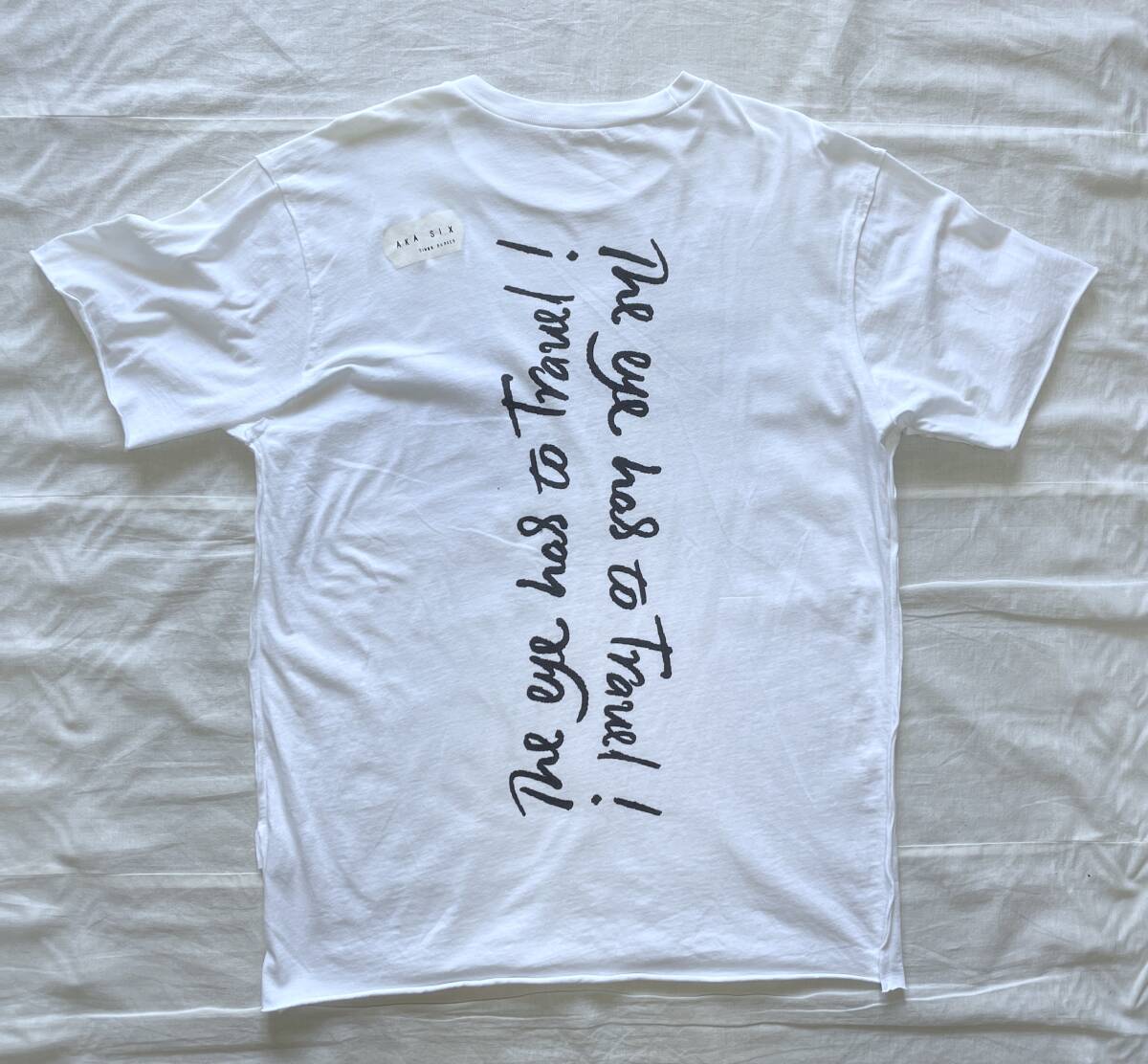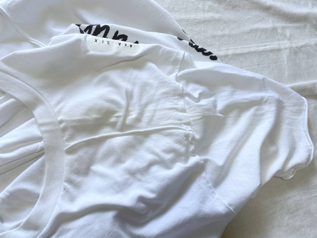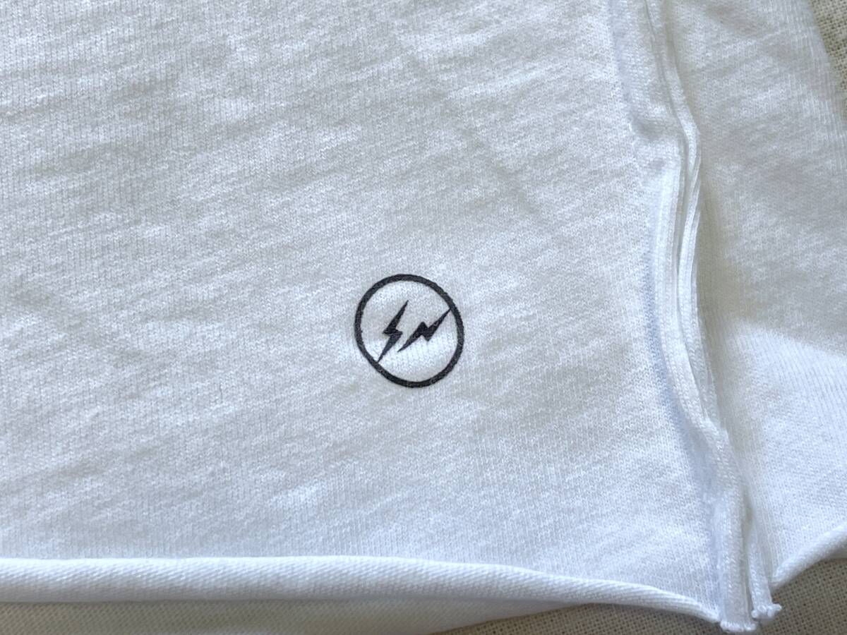 肩にAKA SIXのカミソリ型ロゴ、裾にfragmentのサンダーロゴがプリントされています。