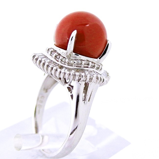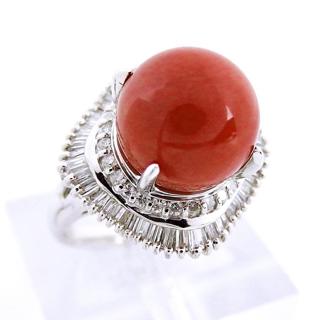 * Pt900 * サンゴ:約11ミリ * ダイヤ:0.85ct * デザイン部大きさ:縦1.8cm×横1.8cm * リング最小幅:2ミリ * 指からの立上り:1.5cm * サイズ:12号 * 重さ:12.3g * 付属品:鑑別書付き(ダイヤモンドグレーディングラボラトリー) * ランク:A (∞ RCO RD PR)22236