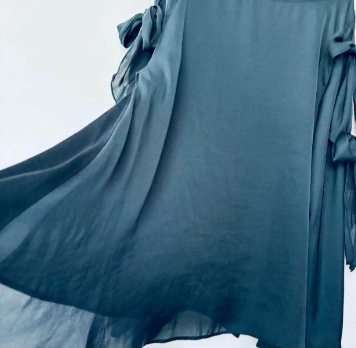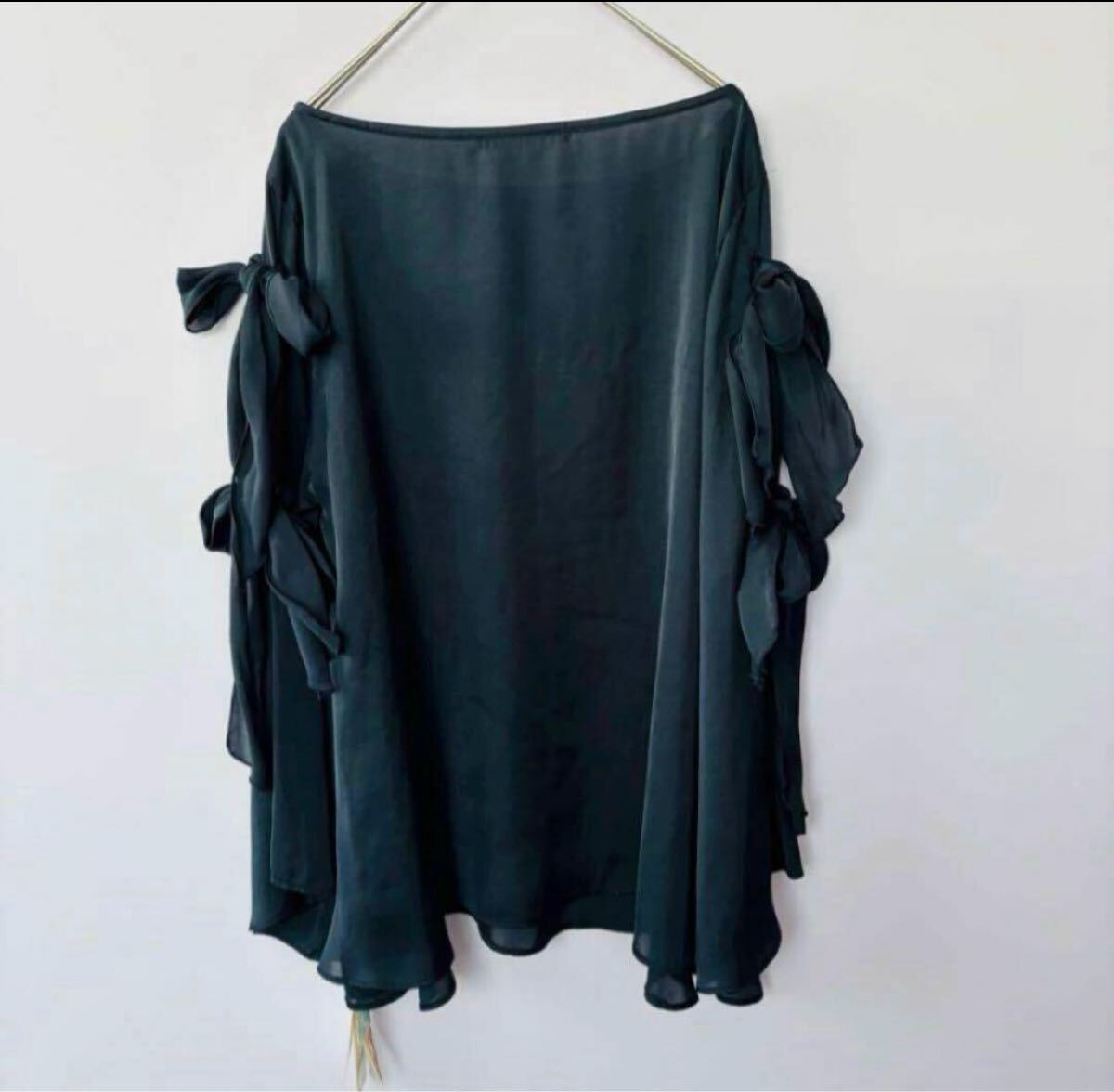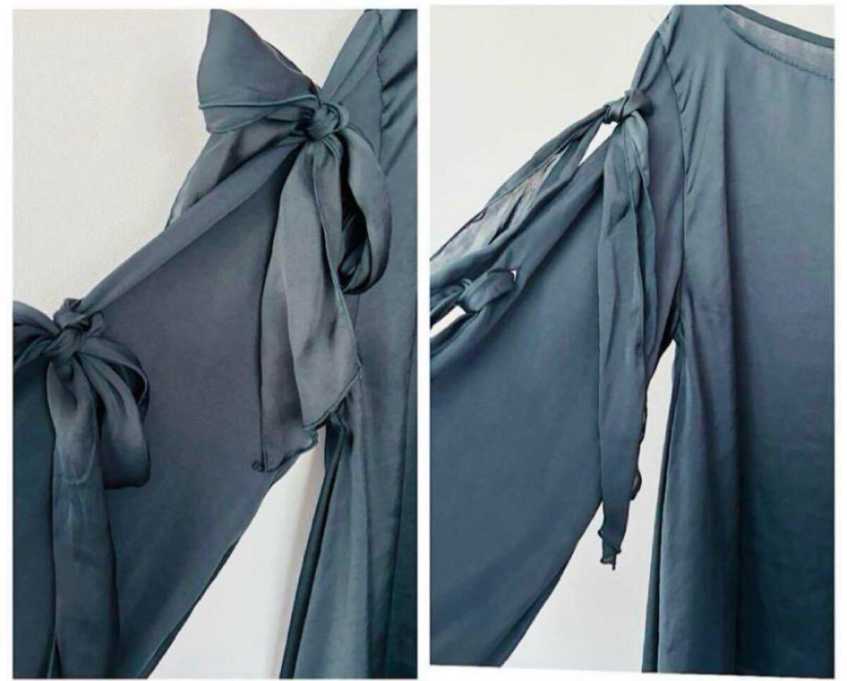 袖に2箇所、穴が空いていて、長めのリボンが通してあり、縛るとリボンになります☆