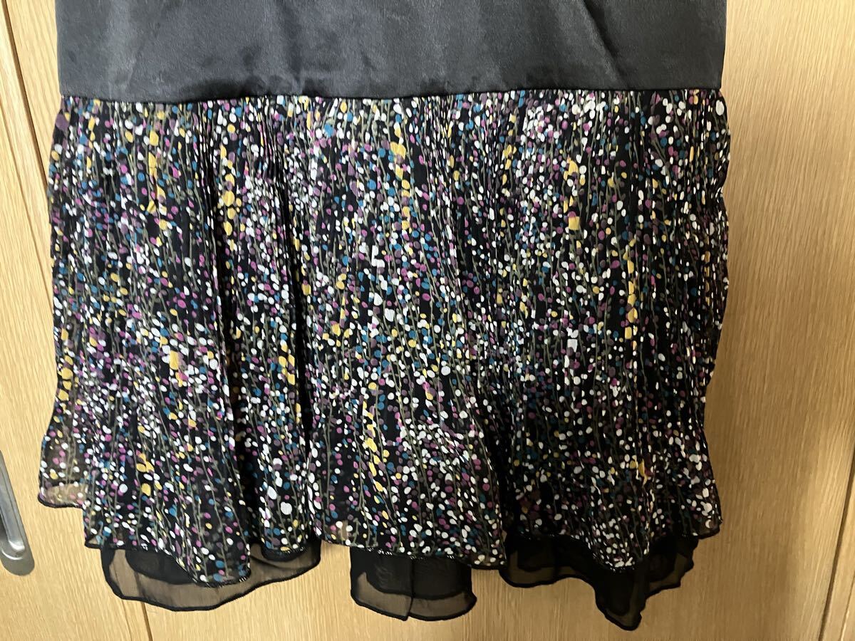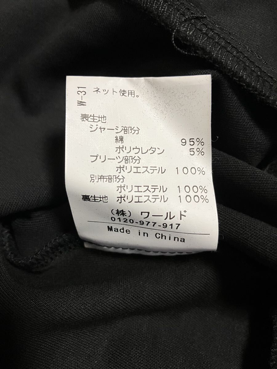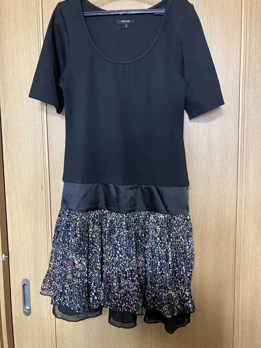 黒の半袖とカラフルなスカート部分が特徴のひざ丈ワンピース。