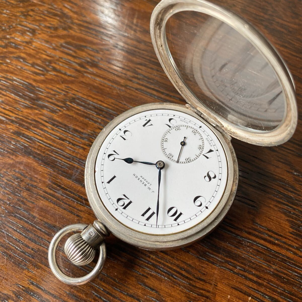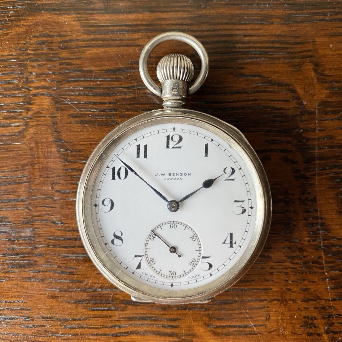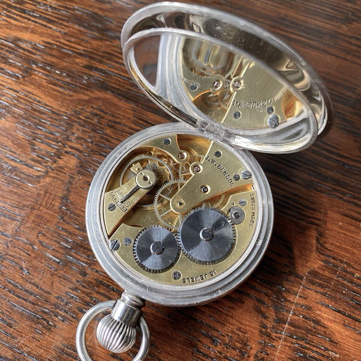 ケースはベンソン社純正の英国製(「JWB」のメーカーズマークがあります)、機械はスイスTavannes社のものだと思います。