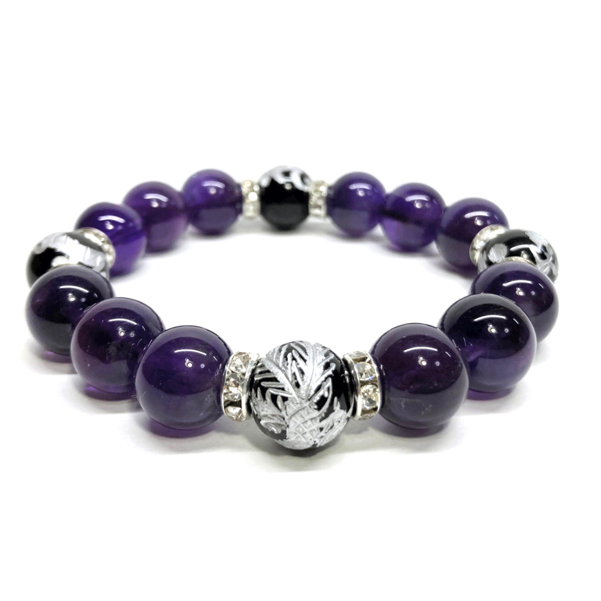 こちらは、四神獣銀彫オニキとアメジストを組み合わせたパワーストーンブレスレットです。四神獣は、中国の伝説で4つの方向(東西南北)を守護する神聖な神。四神獣、厄災から身を守り、多くの運気を呼び込むと言われております。石大きさは程よくインパクトのある12mm玉で内周 約17cmです。 数に限りがございますので気になる方はお早めにどうぞ。
