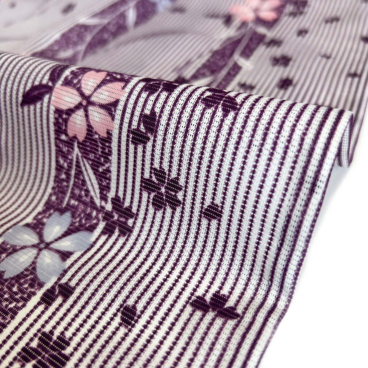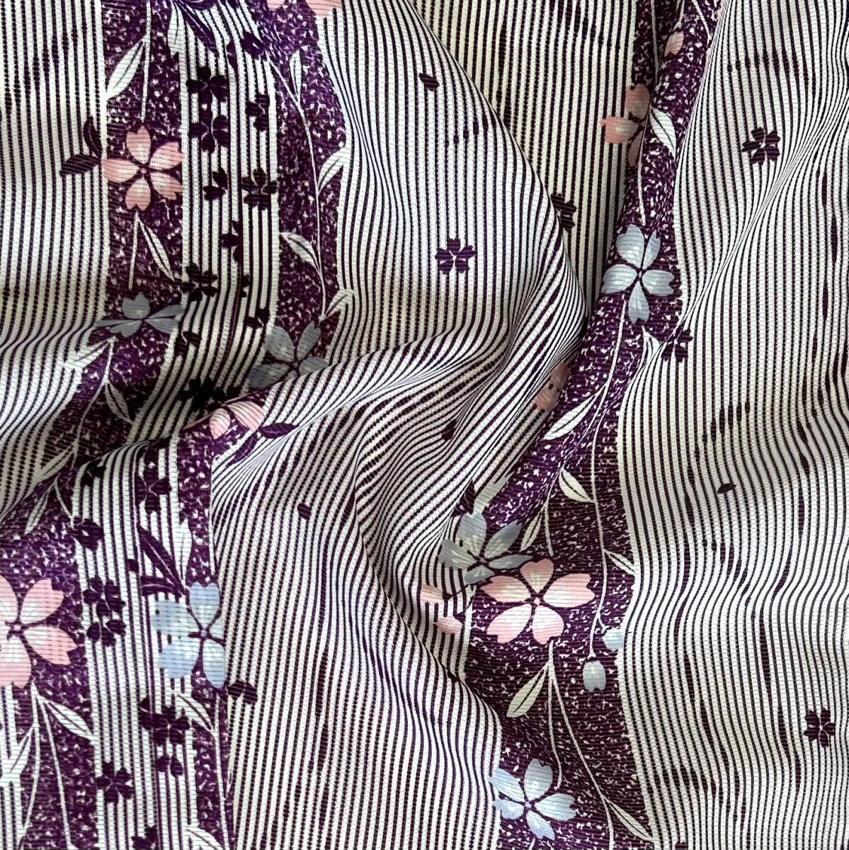 薄いパステルパープルの絽地に、濃いパープルで縦縞が入り、そこに垂れ桜が描かれた、とても綺麗なデザインの単衣のお着物です。どうぞこの機会にご検討下さい!