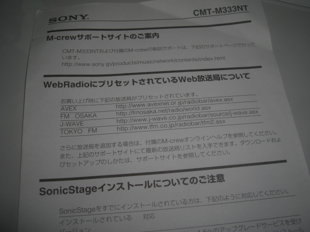 SONY CMT-M333NT付属のCD-ROM M-crew/SonicStageと説明書