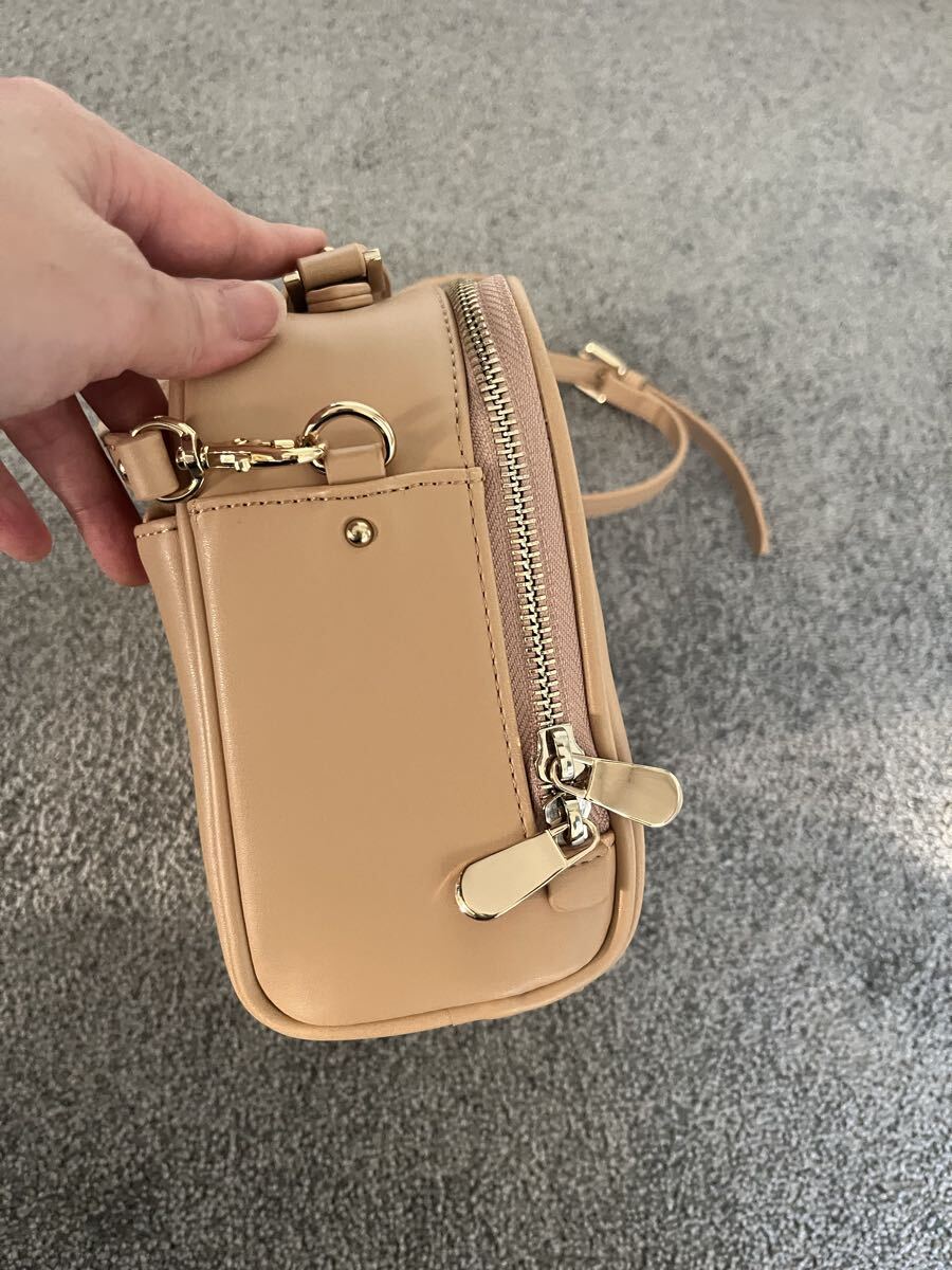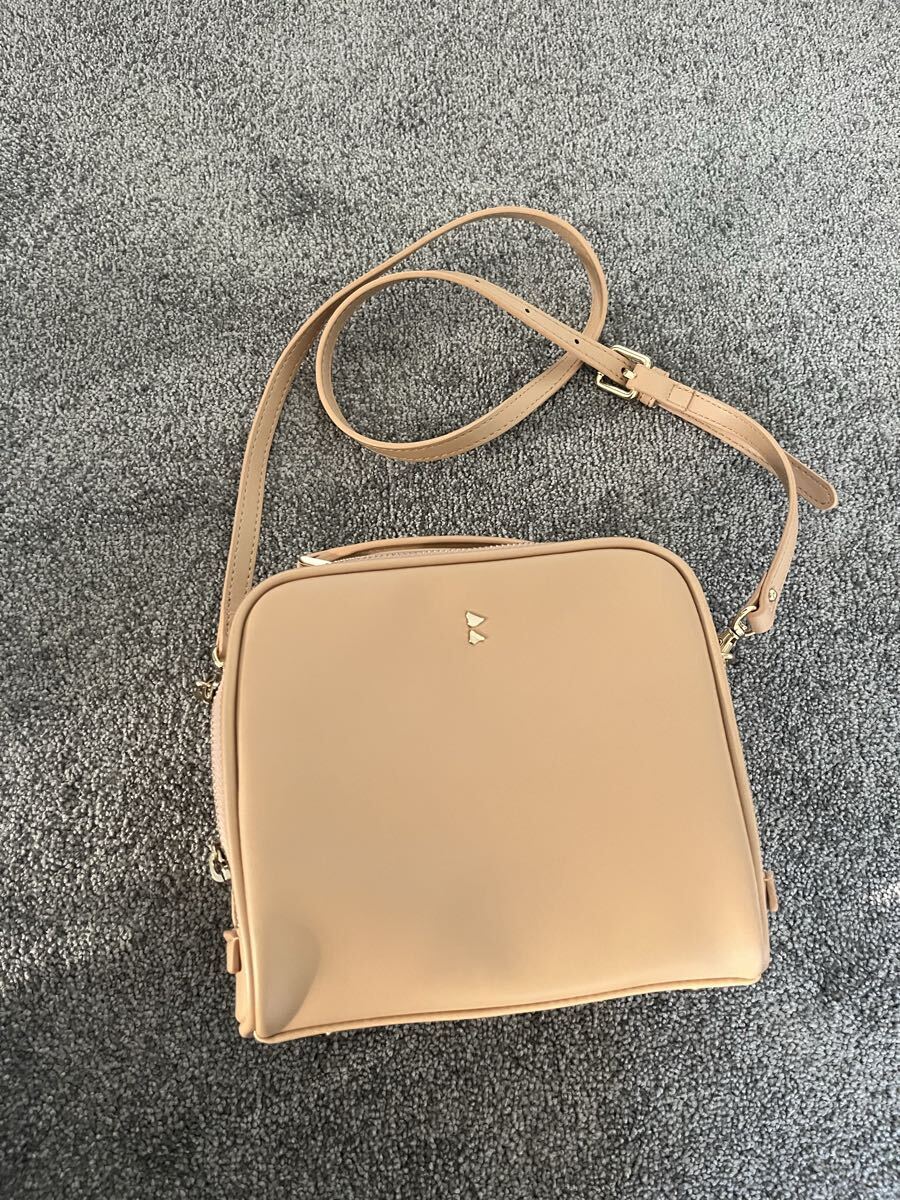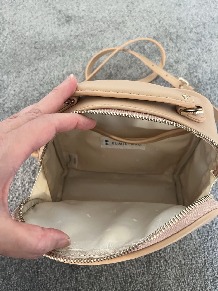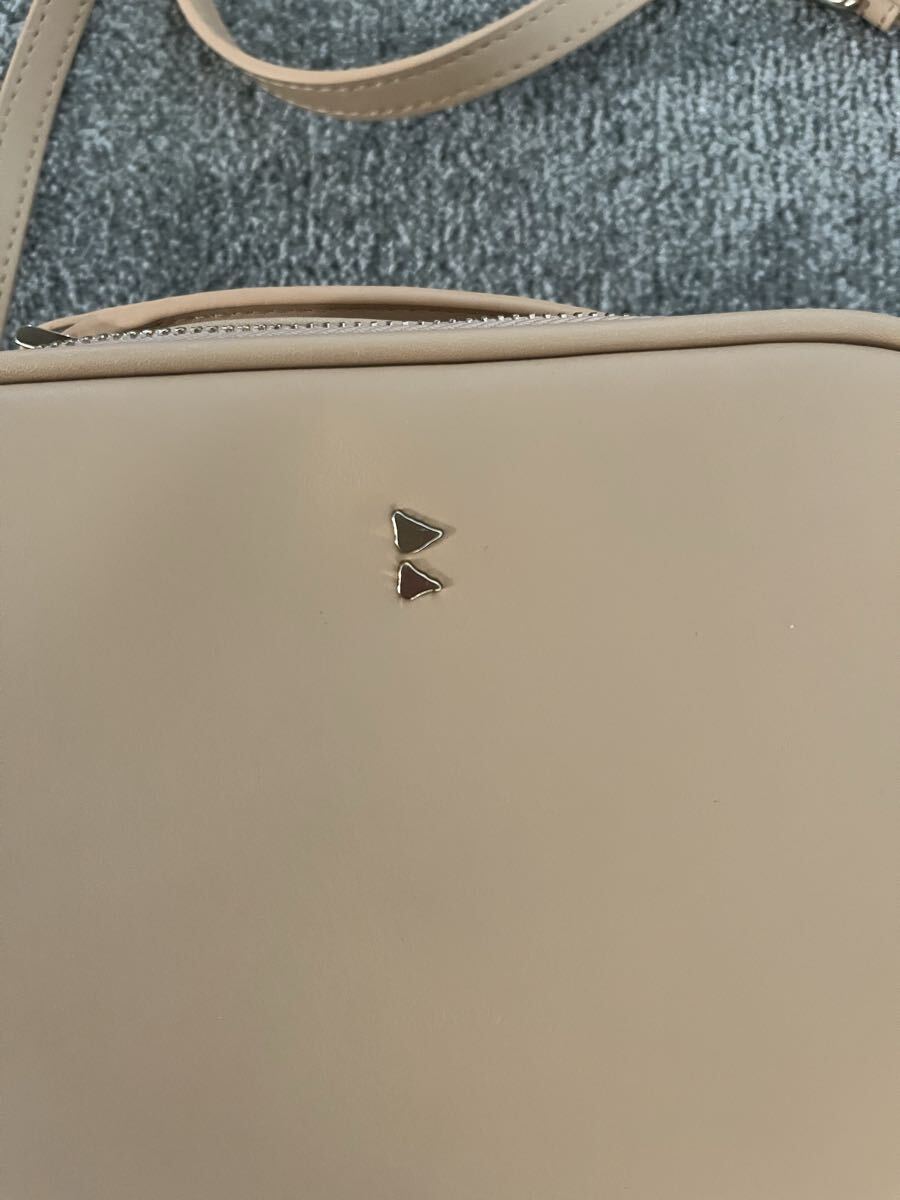 シンプルでスタイリッシュなベージュのショルダーバッグ。