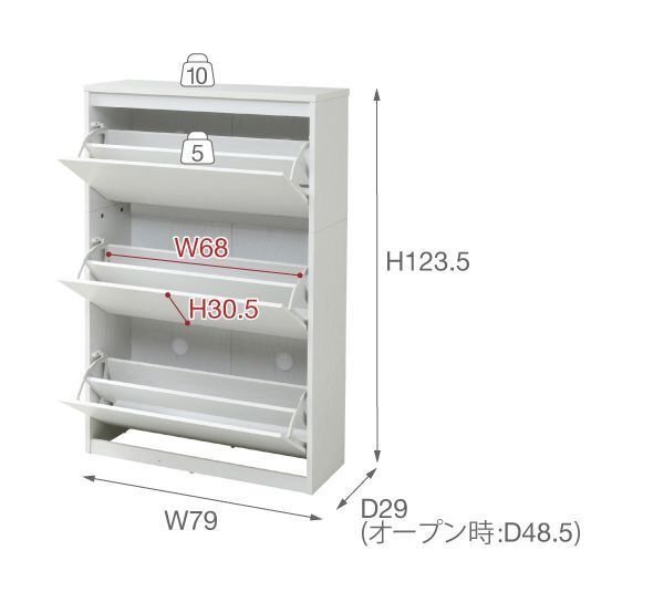 【カラー】 ブラウン、ナチュラル、ホワイト 【サイズ】 <外寸> 幅79×奥行29×高さ123.5cm <内寸> (手前スペース奥行)棚上段設置時:10cm、棚下段設置時:8.5cm、底:6cm (奥スペース奥行)棚上段設置時:8.5cm、棚下段設置時:9.5cm、底:5.5cm (扉内全体)幅68×奥行18.5(底:10)×高さ30.5cm (可動棚)幅72.5×奥行14×厚み1.5cm 【材質】 本体:プリント紙化粧合板 【耐荷重】 天板:10kg以下 フラップ扉:各5kg以下 【生産国】 マレーシア 【梱包】 サイズ:86.5×46×24.5cm、重量:28.7kg 【その他】 ・可動棚:3枚 ・通気口:6個 【組み立て品】 お客様による組み立てが必要です。 【ご注意】 ・サイズ、重量は概算です。 ・商品カラーはご使用のモニターによって実際の明るさや色と異なって見える場合がございます。 |