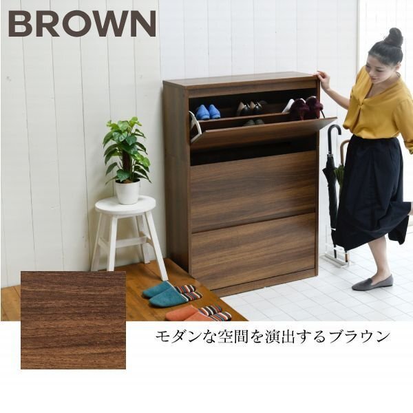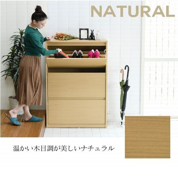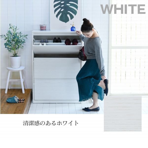 場所を取らない薄型設計のシューズボックス。 玄関に溢れた靴をすっきり収納できます。 天板の上に小物をディスプレイするのにもちょうどいい高さのワイドタイプ。 |