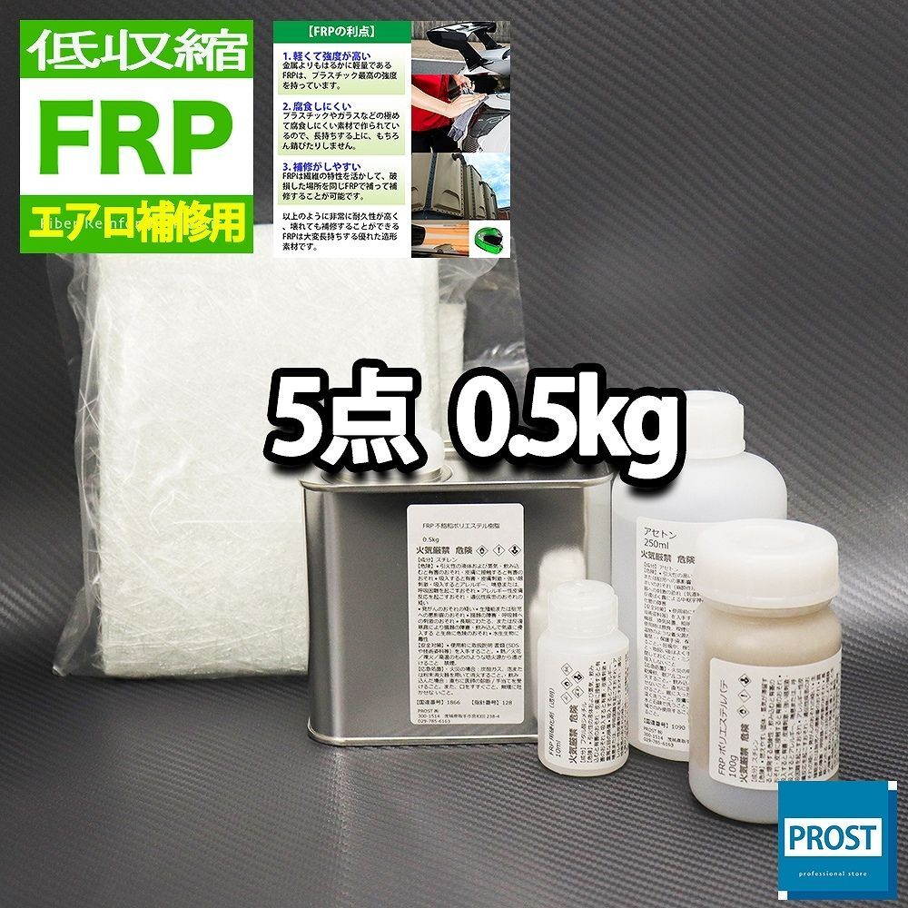 低収縮タイプ FRPエアロ補修5点キット 樹脂0.5kg 一般積層用 インパラフィン 硬化剤 ガラスマット アセトン パテ付き セット Z25