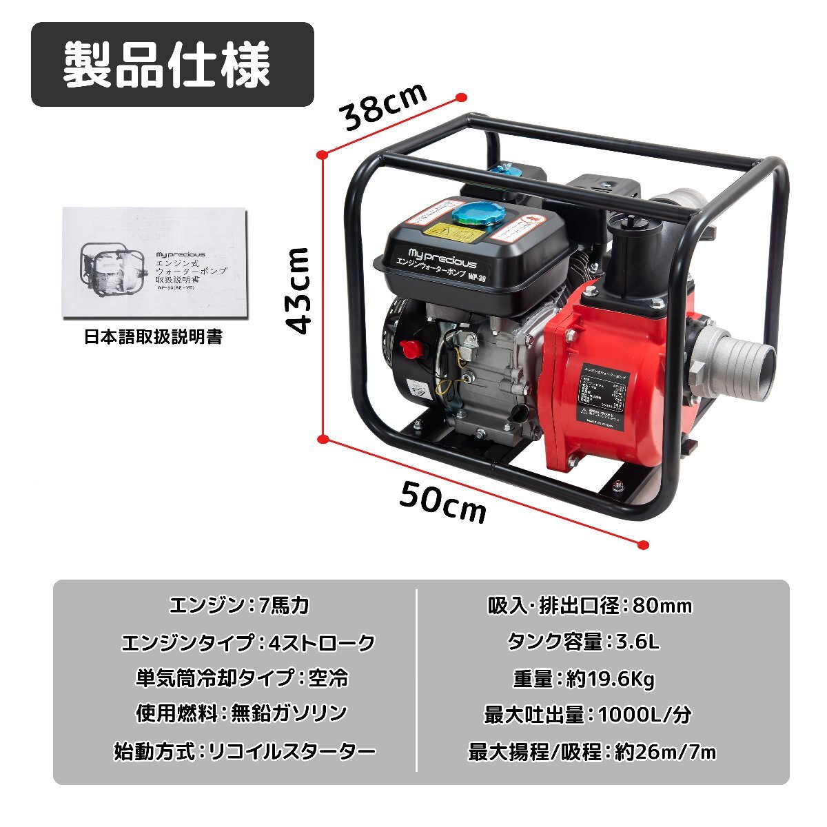 4サイクル 7馬力 エンジンポンプ 3インチ(80mm)タイプ  吐出量:1000L/分 灌漑 排水に