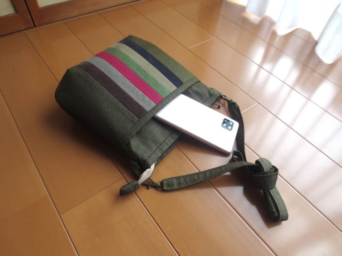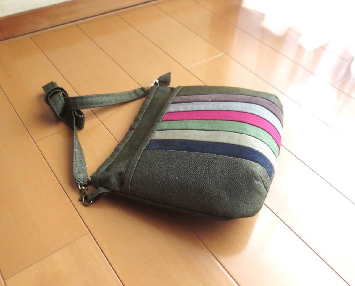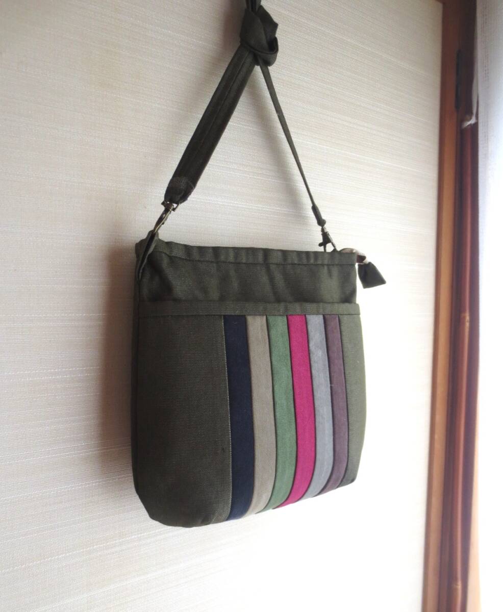 ショルダーバッグ 斜めかけバッグ ハンドメイド コットン製 おしゃれバッグ 深草色 ストライプ プレゼントに