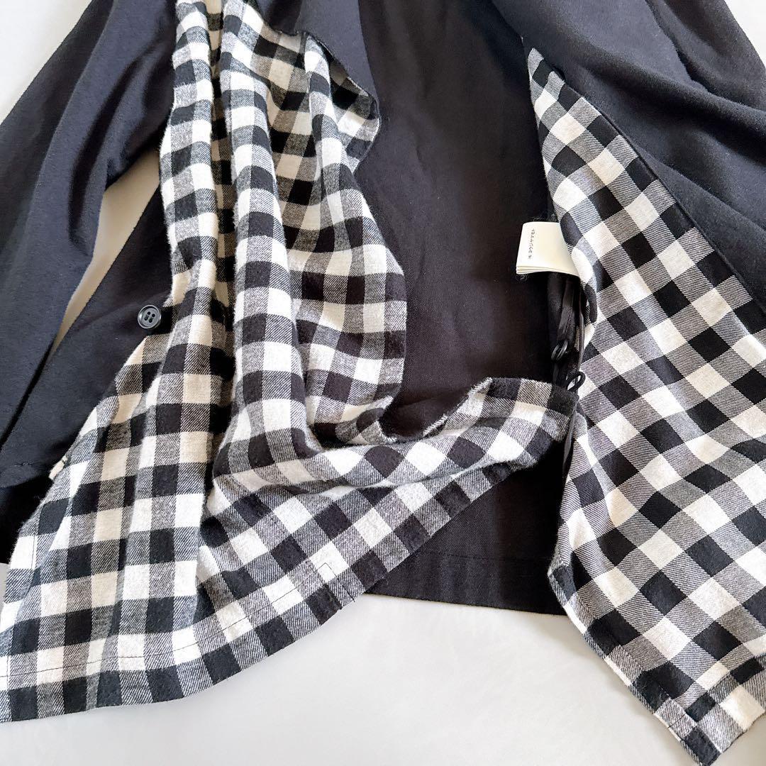 ギンガムチェックのレイヤード風デザインが目を引く一着です。