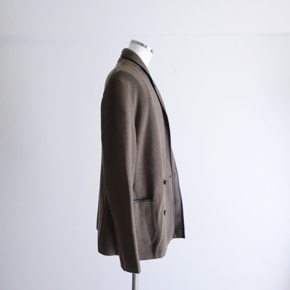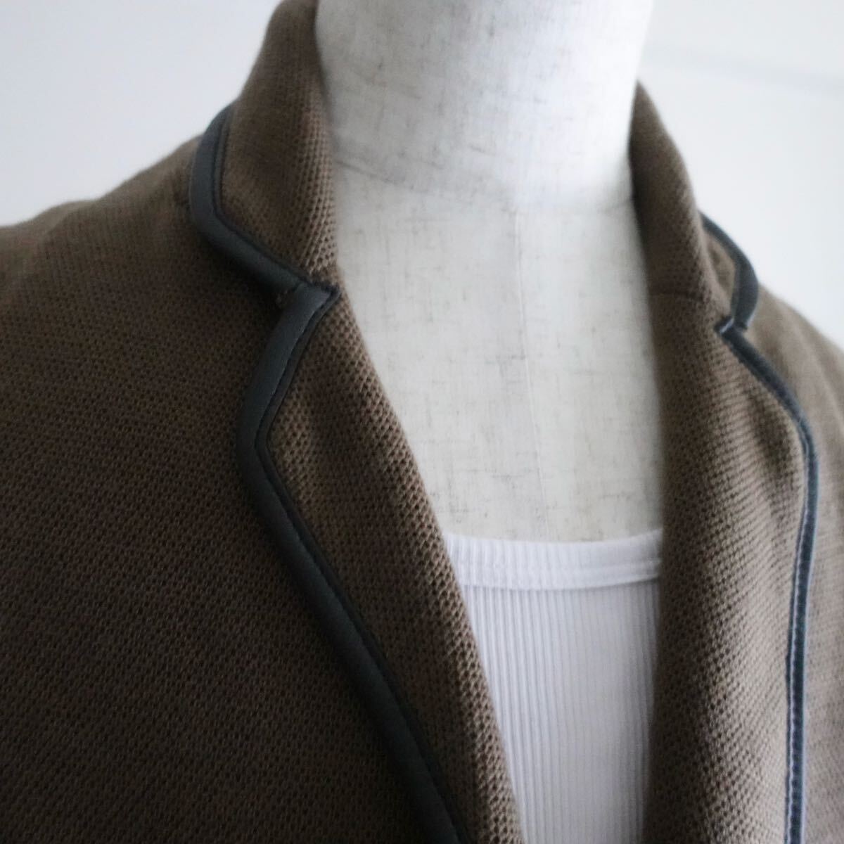 フロント部にレザーパイピングを施したり、マーブルボタンを付けるなど、ニットジャケットながらも、高級感のある印象に仕上げました。