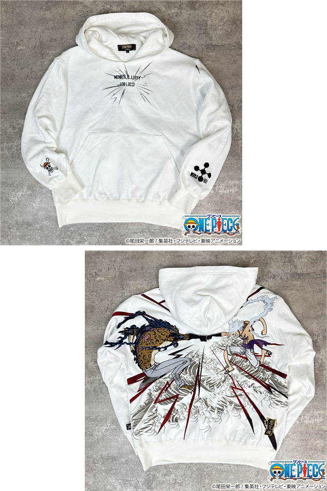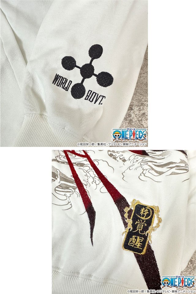 超人気のONE PIECEコラボからエッグヘッド編の新アイテムが登場!! 今回も全て限定描き下ろし!!! ルフィとルッチが拳を交えたシーンを刺繍! 2人の激しい決闘をプルパーカーでデザイン。 麦わらの一味の海賊旗マーク、世界政府のシンボルも刺繍した | |||||||||||||||||||||||||